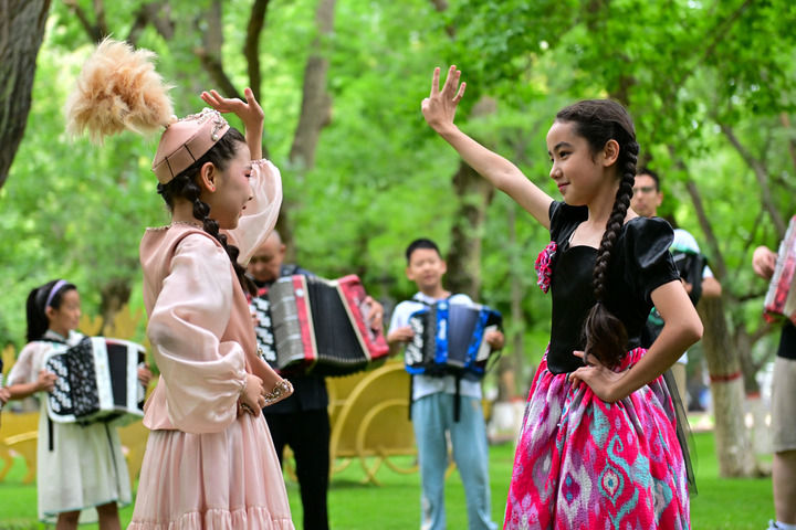 ??在新疆塔城市文化廣場,練習手風琴的孩子隨著琴聲翩翩起舞(2024年7月24日攝)。新華社記者 丁磊 攝