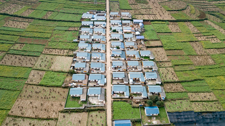 ??俯瞰四川省昭覺縣地莫鄉地莫村田園中的新居(2020年10月10日攝,無人機照片)。新華社記者 張笑宇 攝