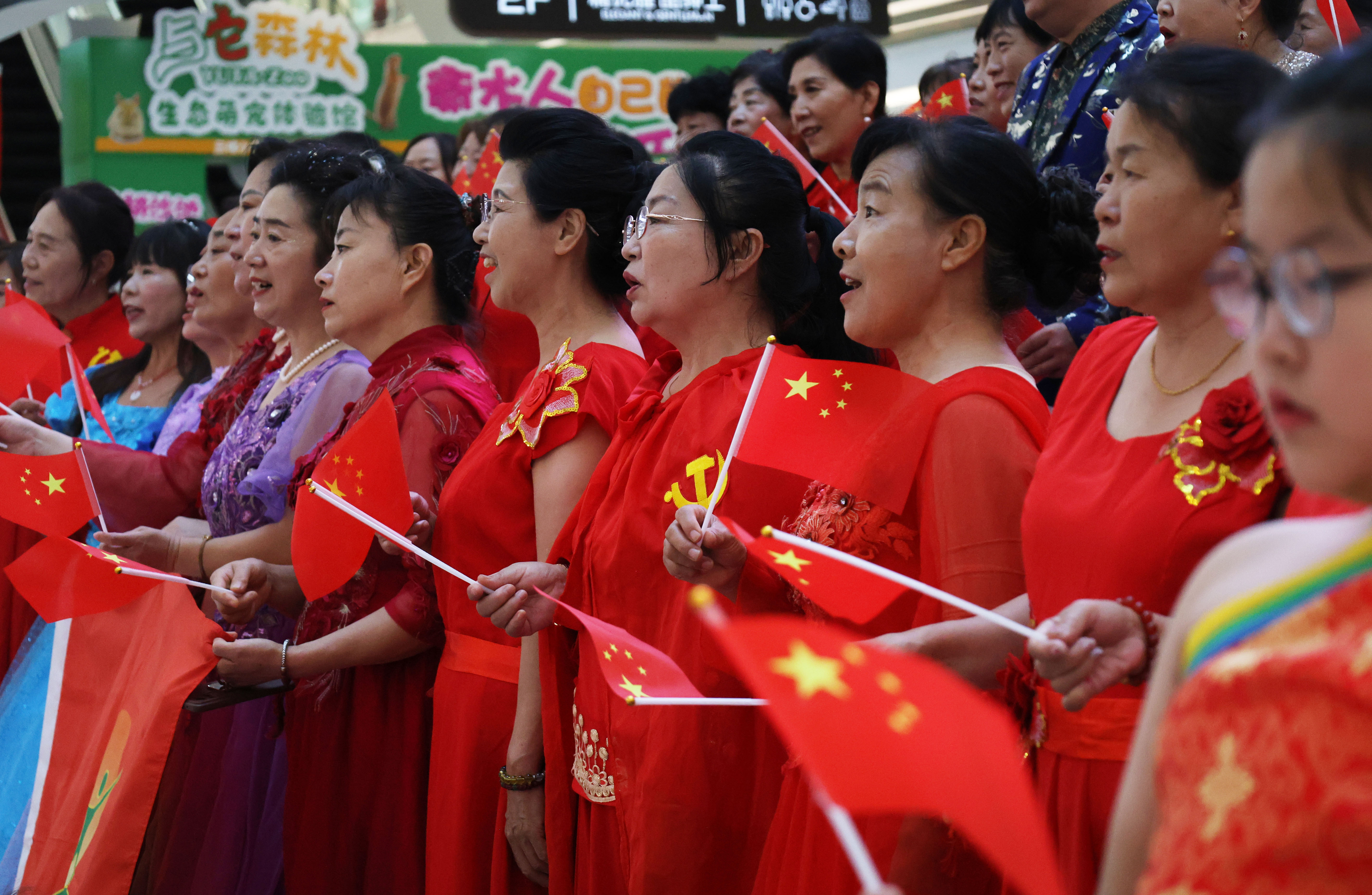 百余名身著紅色服裝、手持紅色國旗的志愿者們,以飽滿的熱情唱響多首愛國歌曲。《歌唱祖國》的激昂旋律拉開了演出的帷幕,“五星紅旗迎風飄揚,勝利歌聲多么響亮……”歌聲嘹亮,振奮人心。緊接著,《我和我的祖國》《沒有共產黨就沒有新中國》兩首大合唱,更是將現場氣氛推向高潮。