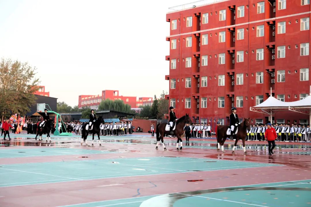 開幕式上,衡實馬術特長生著節日盛裝,駕馭駿馬整齊排列,優雅舞步極盡高雅氣勢,馬蹄越起,更顯馳騁之狀。之后,校徽校訓方隊、花束隊、彩旗隊、教師方隊、各年級學生方隊、特長生方隊依次入場。同學們揮舞著鮮艷的彩旗,口號響亮,步伐有力,陣容整齊,盡情展示創意十足的班級文化。