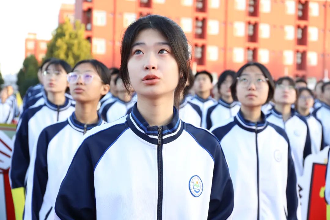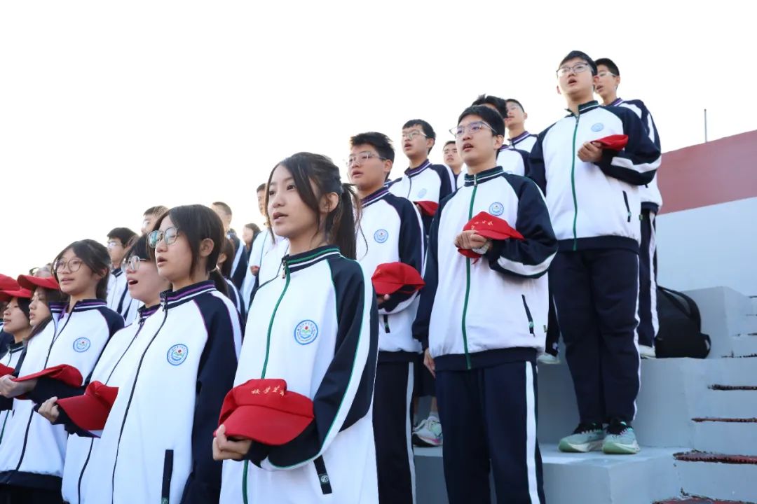 意氣風發的國旗班同學護送五星紅旗進入操場。隨著莊嚴雄壯的國歌聲響起,五星紅旗冉冉升起。全體師生行注目禮,高唱國歌,表達對祖國的熱愛和祝福。