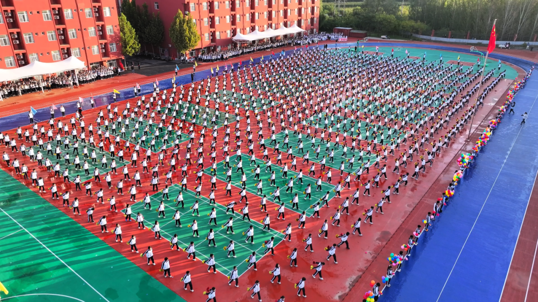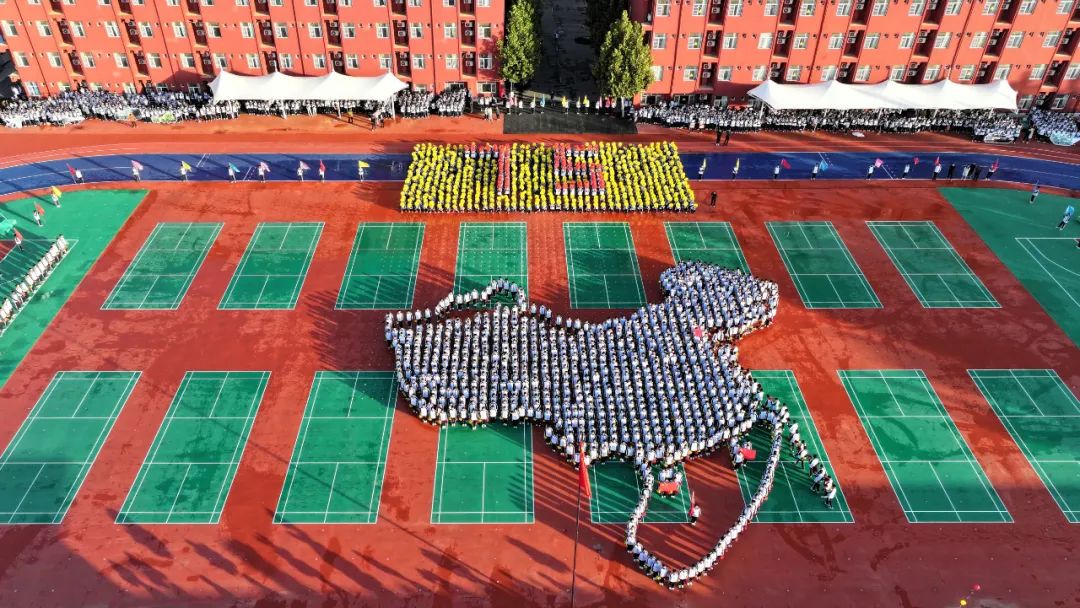 “光輝歷程”由高一五部學子傾情演繹,伴隨著解說,同學們迅速變換扇子顏色,拼出1949、1953、1978等年份數字,一幅幅生動的歷史畫卷在操場上徐徐展開。高一四部學生緊密協作,以精確無誤的方式,共同繪制出中國地圖的壯麗輪廓。與此同時,高一五部的學生則通過默契的配合,以身體為筆,勾勒出數字“75”的圖案,以此莊重地紀念中華人民共和國成立75周年。
