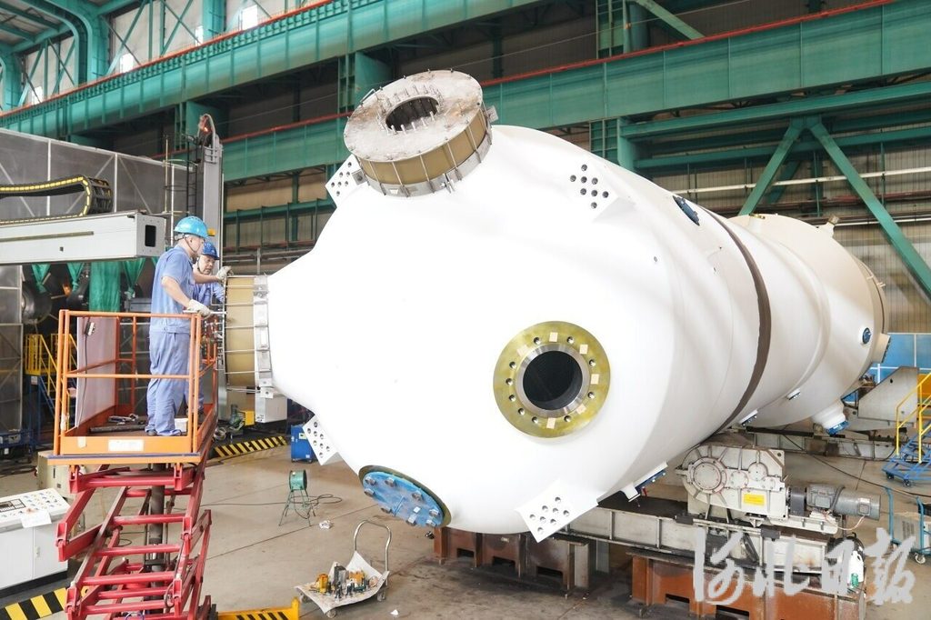 8月22日,哈電集團(秦皇島)重型裝備有限公司的工人在組裝核電蒸汽發生器設備。王繼軍攝