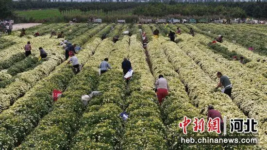 近日,在河北省衡水市冀州區小寨鄉一菊花種植基地,村民正在緊張忙碌地采摘著盛開的菊花。