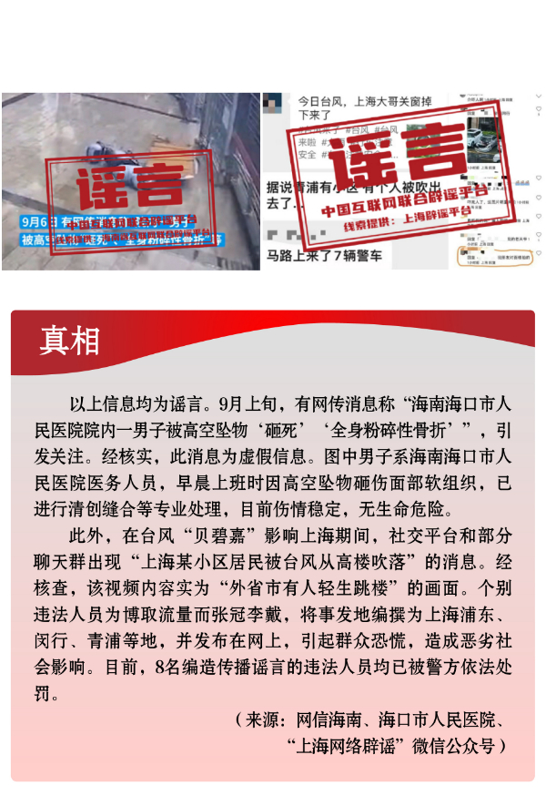炒作災害事故制造焦慮。9月,臺風“摩羯”“貝碧嘉”接連來襲,全國多地災情嚴峻;安徽、新疆等部分地方發生地震,威脅民眾生命財產安全。個別自媒體和網民為博取關注、吸引流量,或夸大其詞,或張冠李戴,或移花接木,借機編造發布“臺風天海南有醫務人員被砸死”“上海有人因臺風被吹落高墜”“廣東某石材城牌坊被臺風吹倒”“臺風‘摩羯’致廣西多地‘一片狼藉’”等不實信息,引發群眾恐慌,造成不良社會影響。謠言“合肥肥東地震導致高層住宅出現裂縫”系拼接剪輯視頻而成,蓄意歪曲事實;“重慶市沙坪壩區突發7級地震”則純屬子虛烏有。此外,一些網民刻意杜撰并擴散“一冷藏車里發現15名被拐兒童”“重慶江北觀音橋抓人販子”“人販子到廣西貴港市中心抓人”等嚴重失實的涉公共安全類謠言,蓄意制造焦慮,擾亂社會秩序。