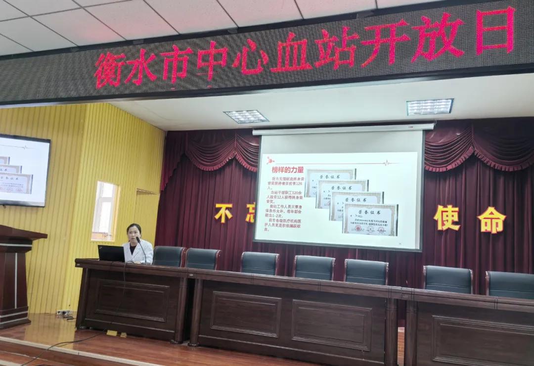 活動當天,血站工作人員進行了血液與健康知識講座。分別從無償獻血的法律法規、認知誤區、獻血類型、獻血標準以及愛心獻血屋地點分布、獻血注意事項和無償獻血的意義、用血優惠政策等方面進行了細致講解,讓學生們對無償獻血有了更加全面的認識。講座結束后,衡水健康科技職業學院相關負責人進行了熱情洋溢的講話,號召青年學生積極參加無償獻血,履行社會責任,用青年之血鑄青年之未來。