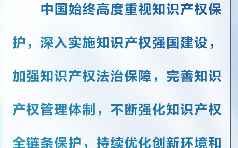 習近平強調,中國始終高度重視知識產權保護,深入推進知識產權強國建設,推動知識產權事業取得歷史性成就,走出了一條中國特色知識產權發展之路。中方愿同各方一道,繼續加強合作,堅定維護國際知識產權多邊體系,為打造有利于創新發展的國際環境貢獻中國智慧和中國方案,推動全球知識產權治理體系向著更加公正合理方向發展,為增進人類福祉貢獻中國力量。