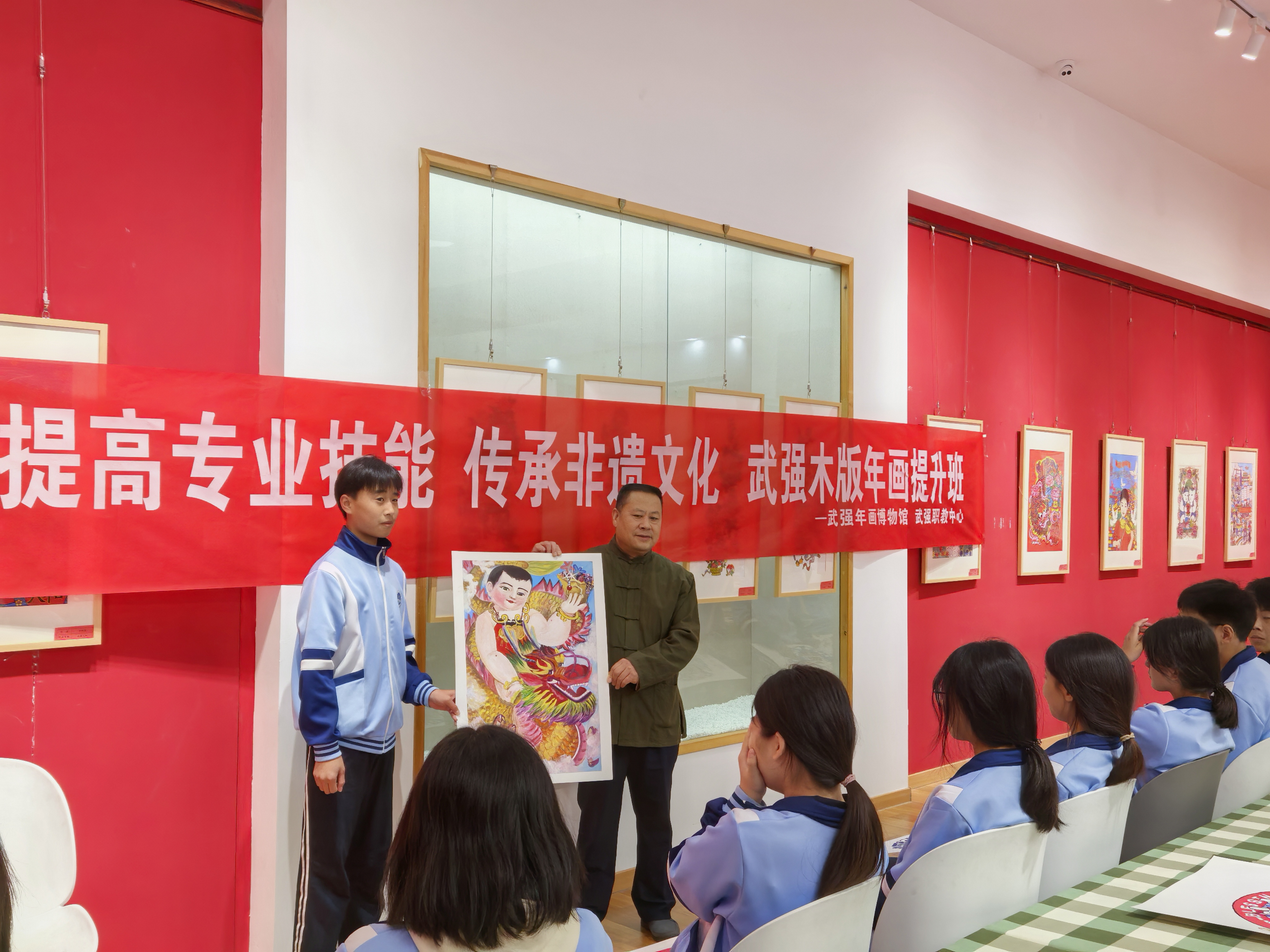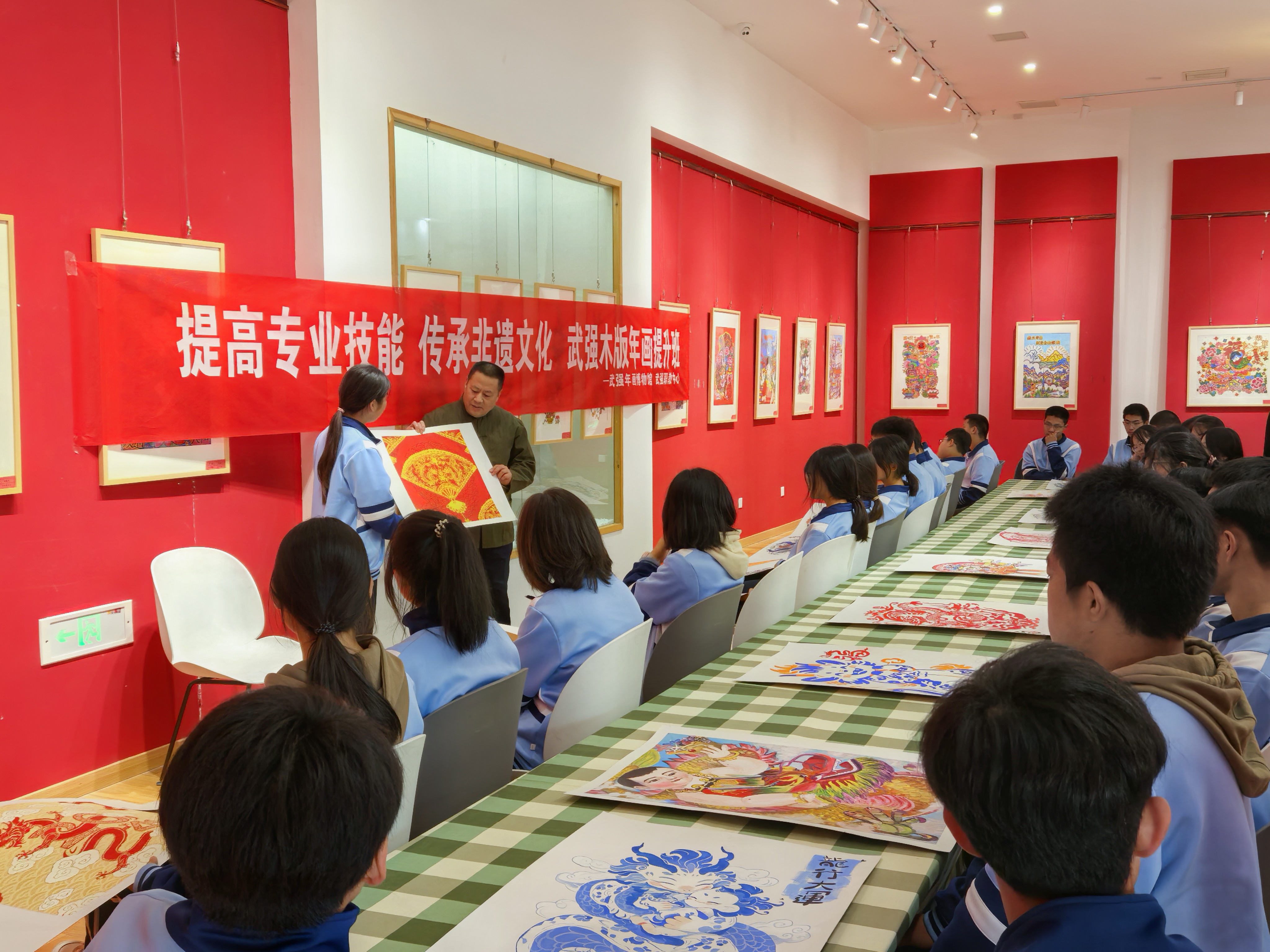 此次“提升專業技能 傳承非遺文化”武強木版年畫提升班活動由武強年畫博物館與武強職教中心共同舉辦。課程共分為兩個課堂,在第一課堂,來自武強職教中心的學生們走進武強年畫藝術展、武強年畫廉政展、武強年畫技藝展展廳。博物館講解員從年畫構思上、年畫用色上、版畫特點上,新一代年畫創作者的使命擔當等方面為學生們進行了深入的講述。