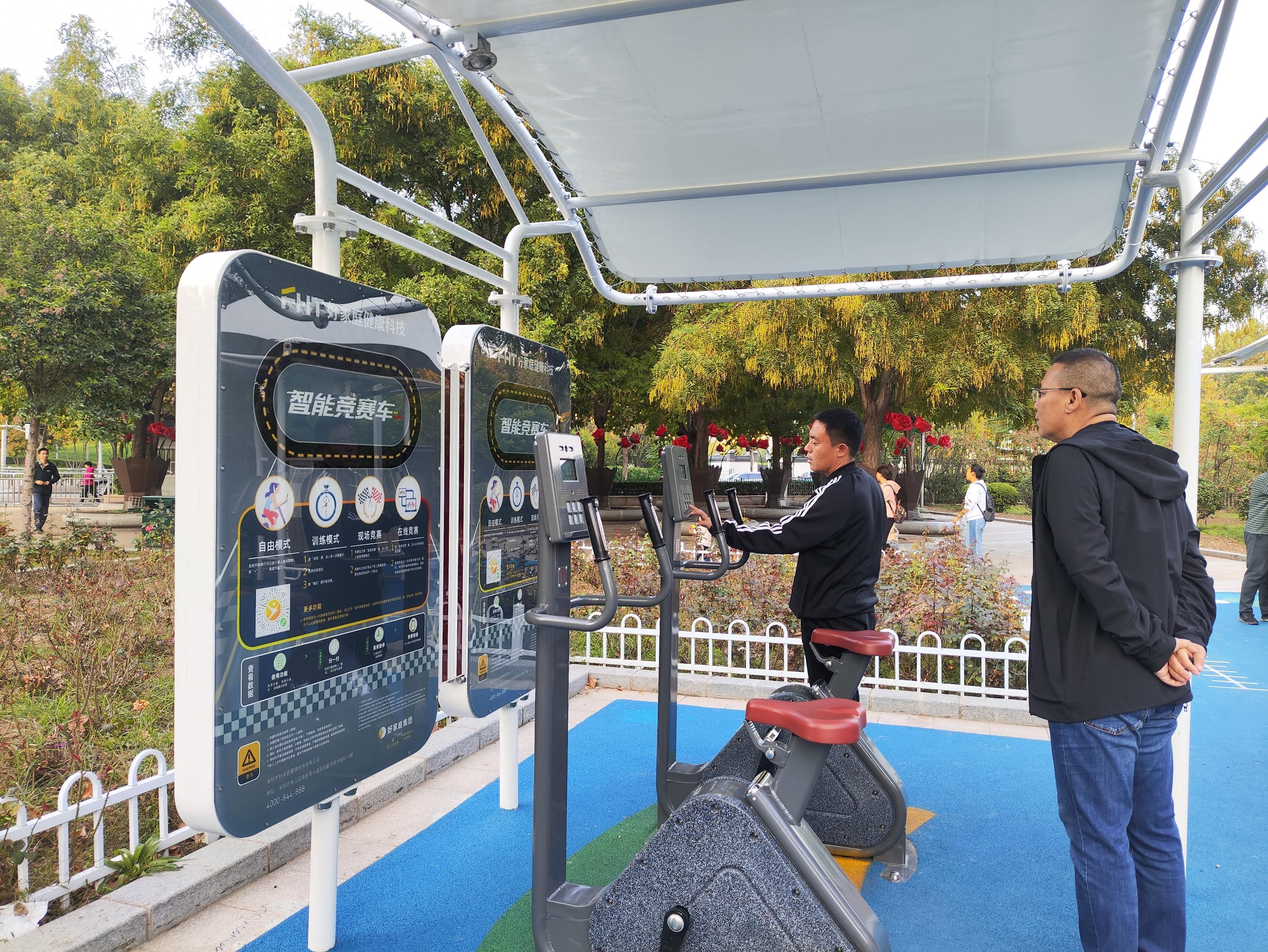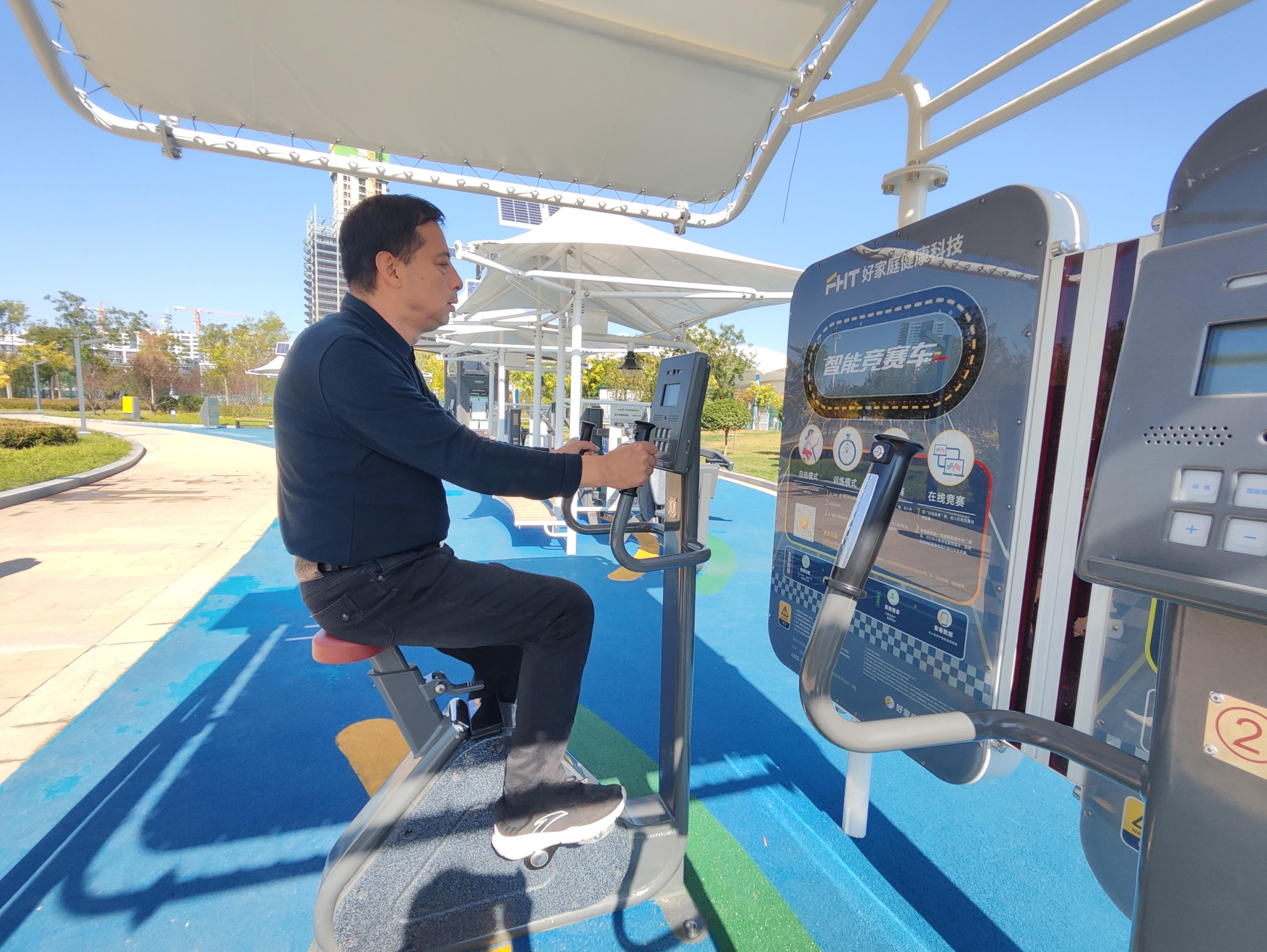 市民在中央綠色體育公園的室外智能健身房通過智能競賽車鍛煉