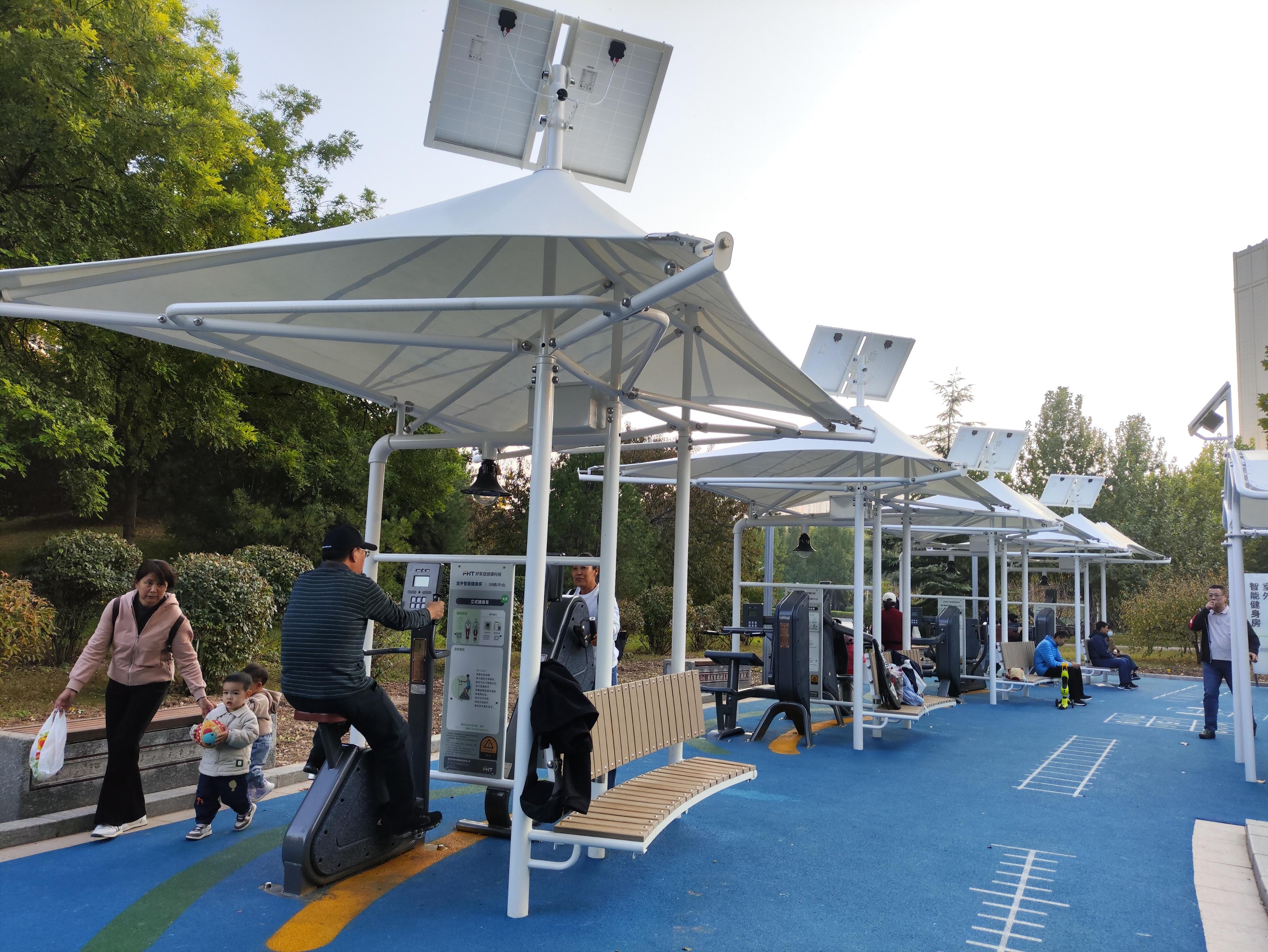 這處室外智能健身房包含“體測區(qū)”“力量和有氧訓(xùn)練區(qū)”“競賽區(qū)”三個(gè)區(qū)域。其中,在主要用于鍛煉的“力量和有氧訓(xùn)練區(qū)”,配備了上肢肩關(guān)節(jié)雙功能訓(xùn)練器、上肢屈伸雙功能訓(xùn)練器、推胸劃船雙功能訓(xùn)練器、深蹲提踵雙功能訓(xùn)練器、腹背肌雙功能訓(xùn)練器、腿部屈伸雙功能訓(xùn)練器、高拉推舉雙功能訓(xùn)練器、立式健身車共8種不同功能的健身器材,每件器材都裝有太陽能電池板,還有遮陽棚和照明燈,且配有使用說明。