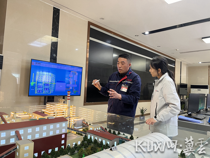德龍鋼鐵燒結(jié)廠燒結(jié)車間主任呂萬峰(左)為記者介紹脫硫脫硝設(shè)備。長城網(wǎng)·冀云客戶端記者 張嘉琪 攝