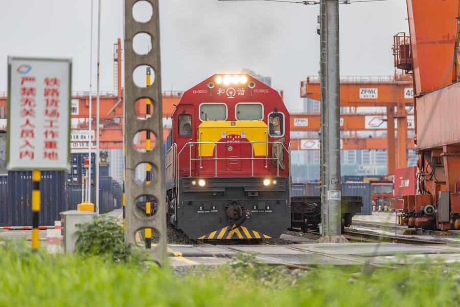 ??2024年7月30日,在重慶國際物流樞紐園區,一列裝載機械設備、汽車和筆記本電腦的中歐班列從重慶團結村中心站駛出。新華社記者 黃偉 攝