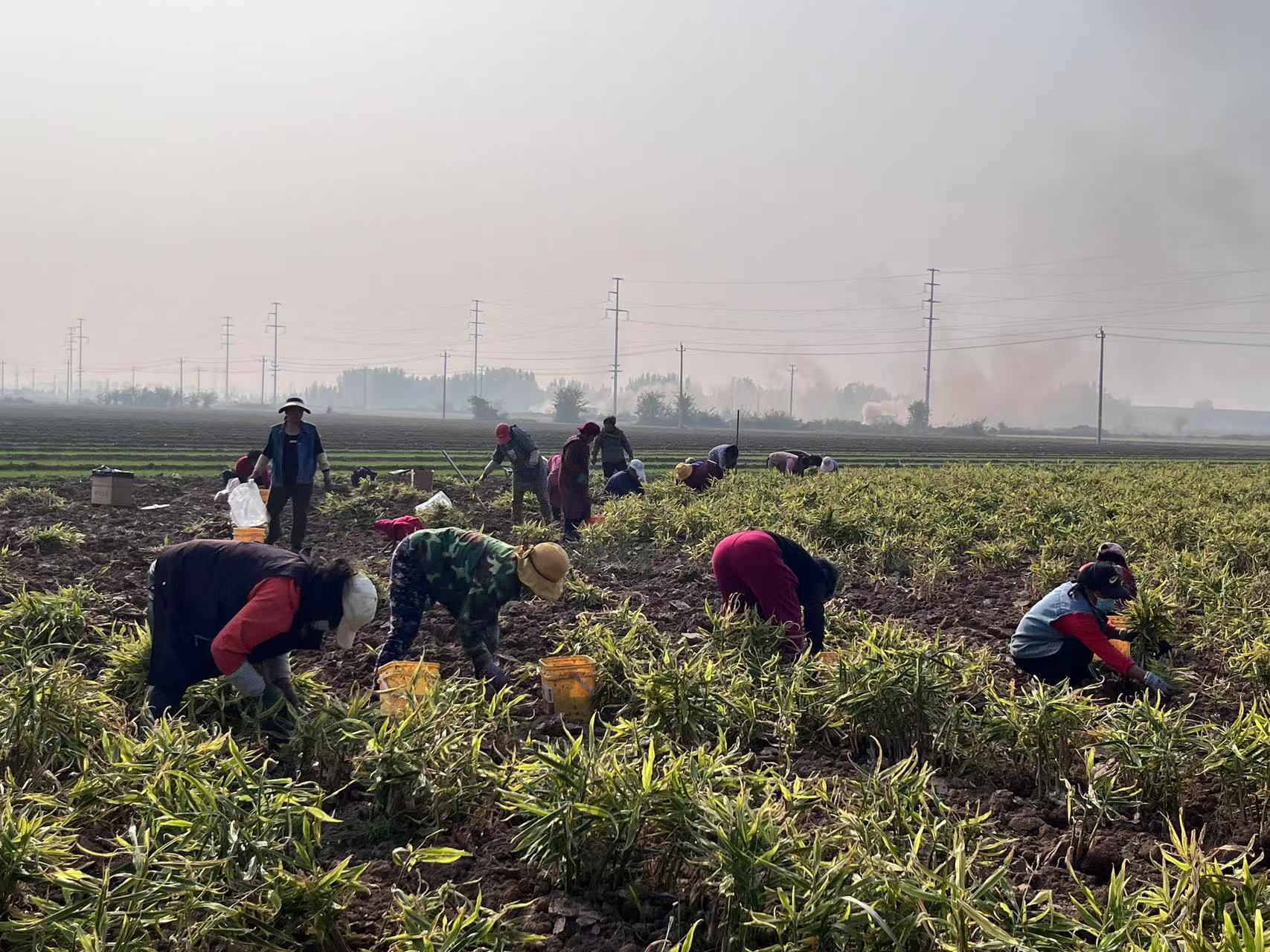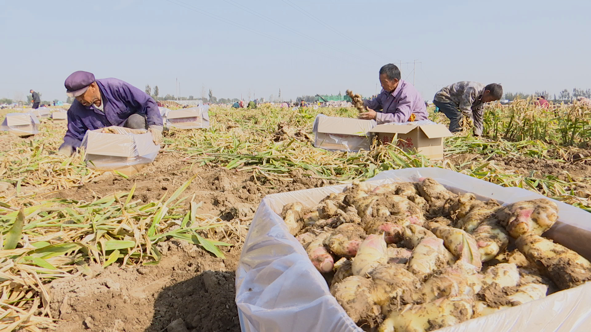 “從一開始選姜種、出苗后放風、搭遮陽網、拔草施肥,到現在收獲,我就一直在這兒工作了,一天110塊錢,不用出村兒就能掙錢。”打工村民楊俊影說道。隨著她開始嫻熟地挑姜種、拔姜、削姜苗,一會兒功夫,一簇簇個頭飽滿、色澤鮮亮的生姜就整整齊齊地堆碼成了“小山”,一陣陣濃郁的姜香伴著泥土味撲鼻而來。