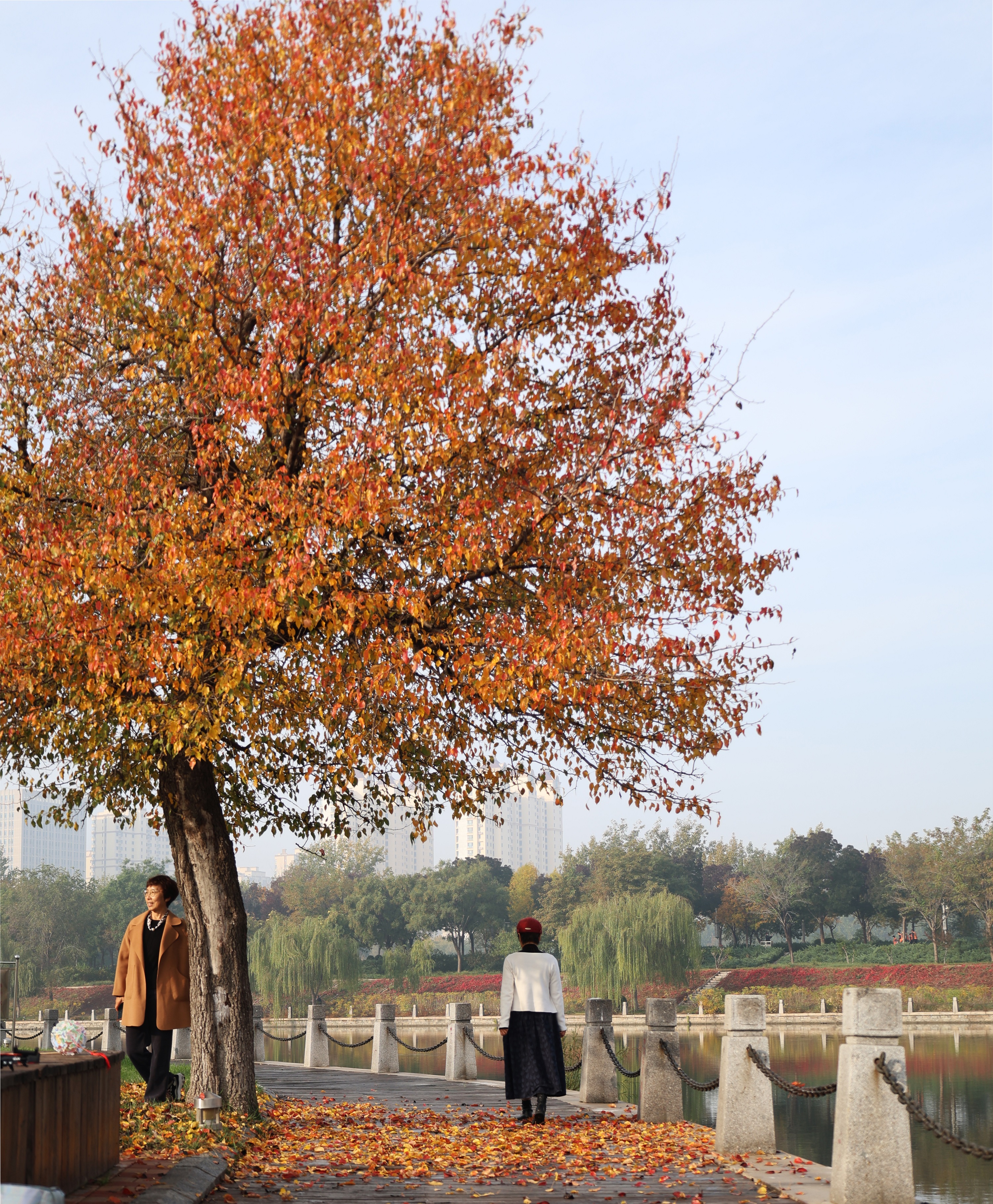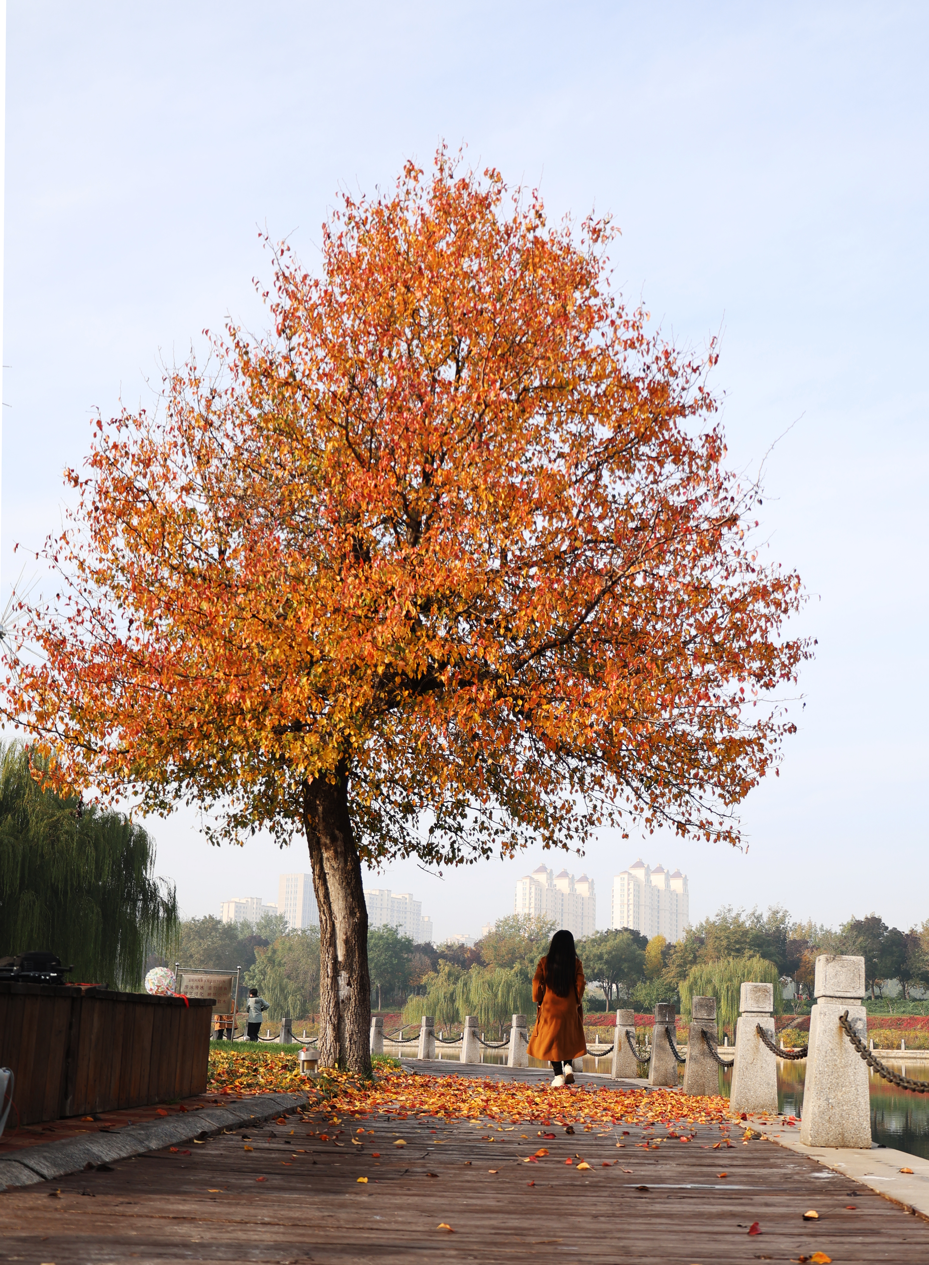 如今,記者在蕭何文化廣場對面目睹了它的風(fēng)采。它依舊獨自矗立在距離河邊僅幾米之遙的地方,樹上紅黃相間的葉子交相輝映,美不勝收。那紅色的葉子恰似燃燒的熊熊火焰,熱烈而奔放,洋溢著生命的激情;黃色的葉子仿若閃耀的璀璨金箔,明亮而奪目,散發(fā)著迷人的光輝。它們相互交織在一起,在微風(fēng)的輕拂下輕輕搖曳,仿佛在低聲訴說著這個季節(jié)的動人故事。