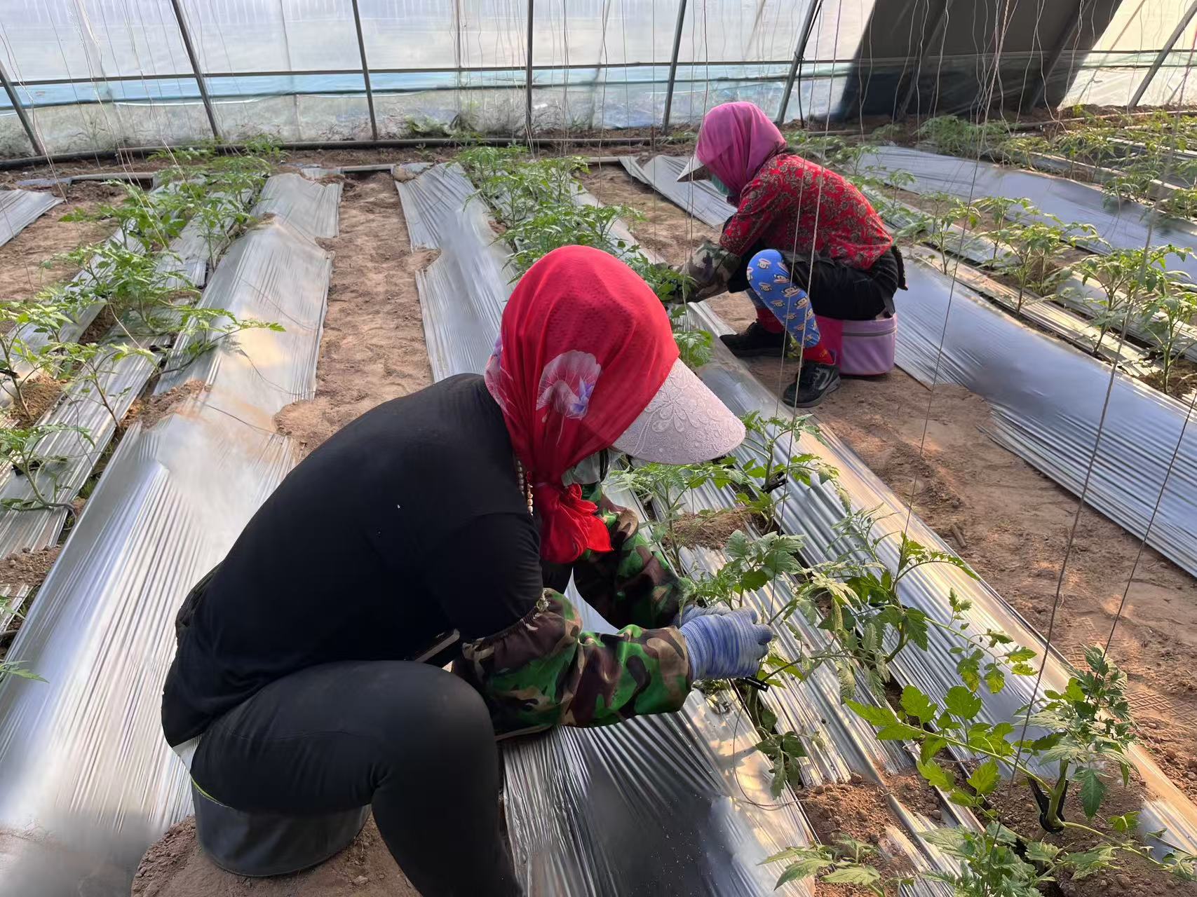 棚內,幾名工人正忙碌著管護西紅柿幼苗。