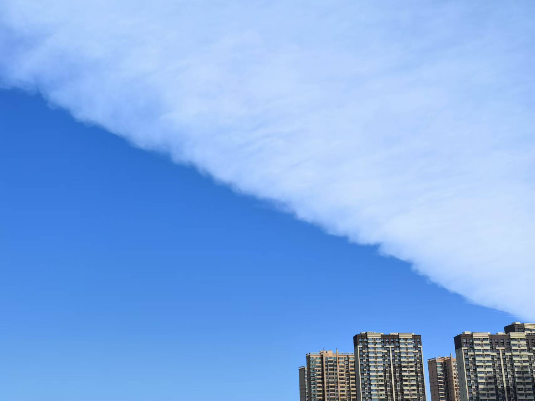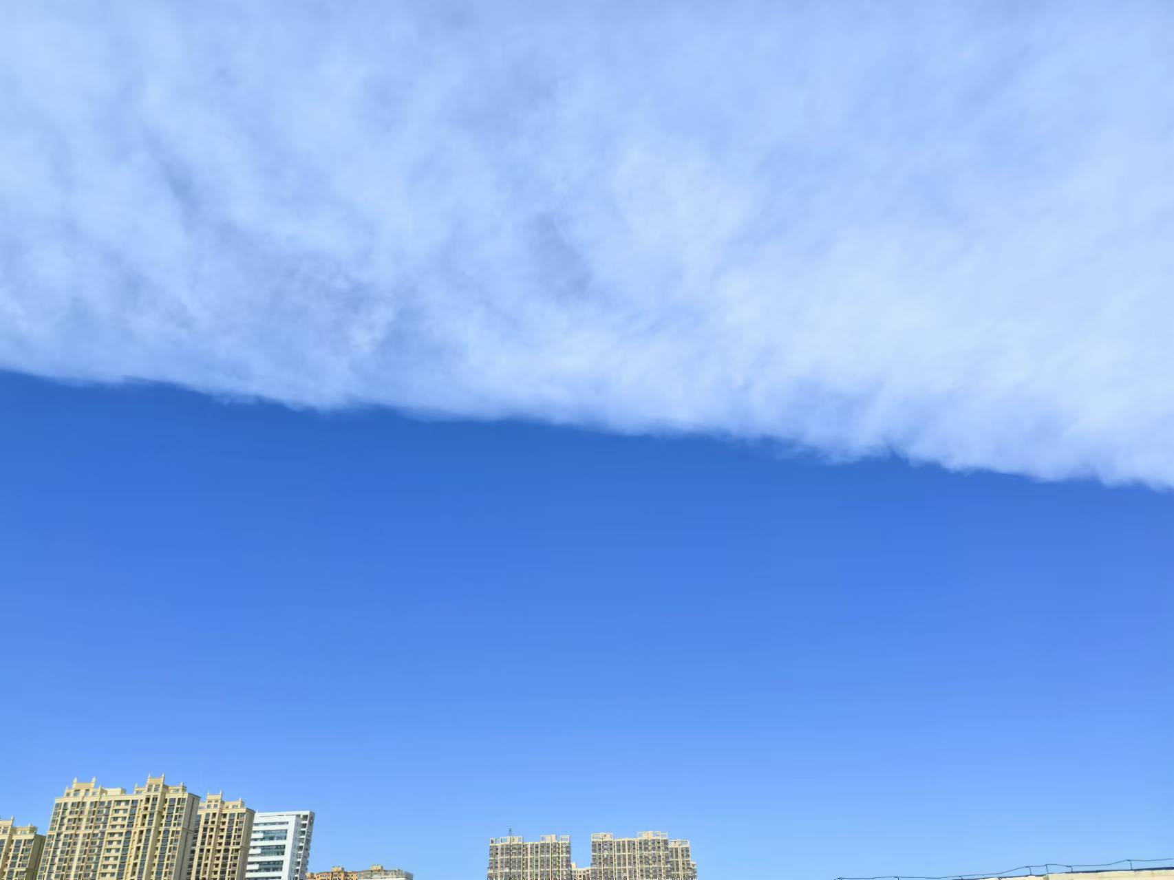 4日中午,我市天空出現“被子云”奇觀,一半是純白的云,一半是蔚藍的天。只見天空自帶 “分割線”,白云和藍天被整齊切開,仿佛是一床雪白的棉花被子蓋在空中,又像是涇渭分明的“鴛鴦火鍋”,分外美麗壯觀。