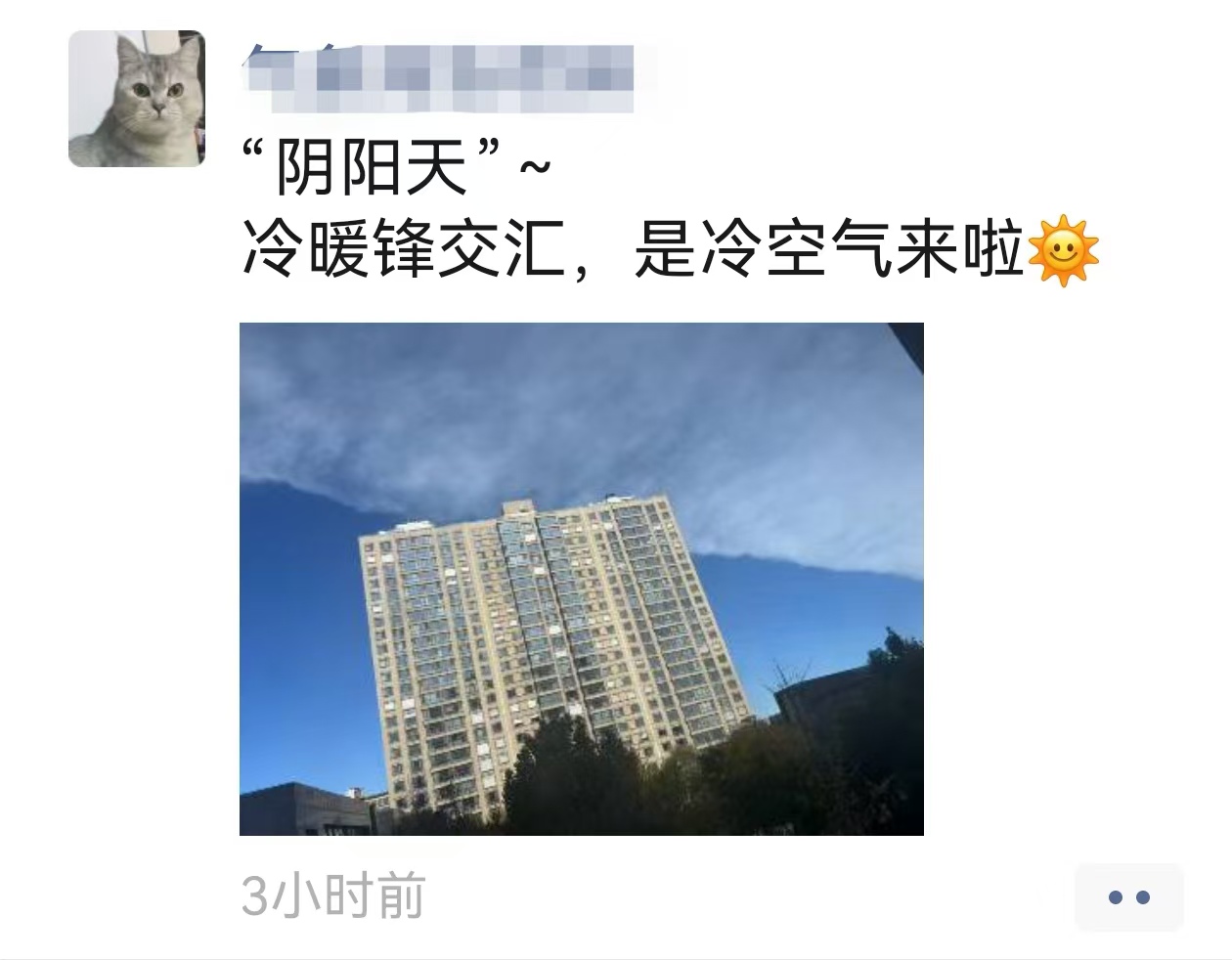 關于這個問題,主要是由于前段時間的我市總體氣溫偏暖,像3日我市最高氣溫達到23℃,可4日強冷空氣自北向南來襲,最高氣溫急速下降到10℃上下,冷暖空氣在我市上空對峙,也是因此,我市的天空上方才會出現“陰陽天”現象。