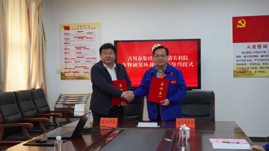 為進一步優化釀酒原料品種、提升產品品質,打造山東省高粱產業提質增效的新標桿,11月8日,古貝春集團與山東省農科院在古貝春辦公樓三樓會議室正式簽署了戰略合作協議,標志著雙方在釀酒原糧科技研發領域的深度合作再度啟航。來自山東省農業科學院作物研究所專職副書記劉賓,山東省農業科學院作物研究所研究員、雜糧遺傳育種與栽培創新團隊負責人張華文,山東省農業科學院作物研究所成果轉化科科長劉佳,山東省農業科學院作物研究所王潤豐博士,趙影星博士,古貝春集團有限公司黨委書記、董事長徐秀菊,黨委副書記、總經理張洪昌,副總經理趙殿臣、杜新勇,總經理助理、副總工程師王廣鵬,總經理助理、行政管理辦公室主任丁北云以及技術中心主任王朝青等領導共同見證了這一重要時刻。活動由杜新勇主持。