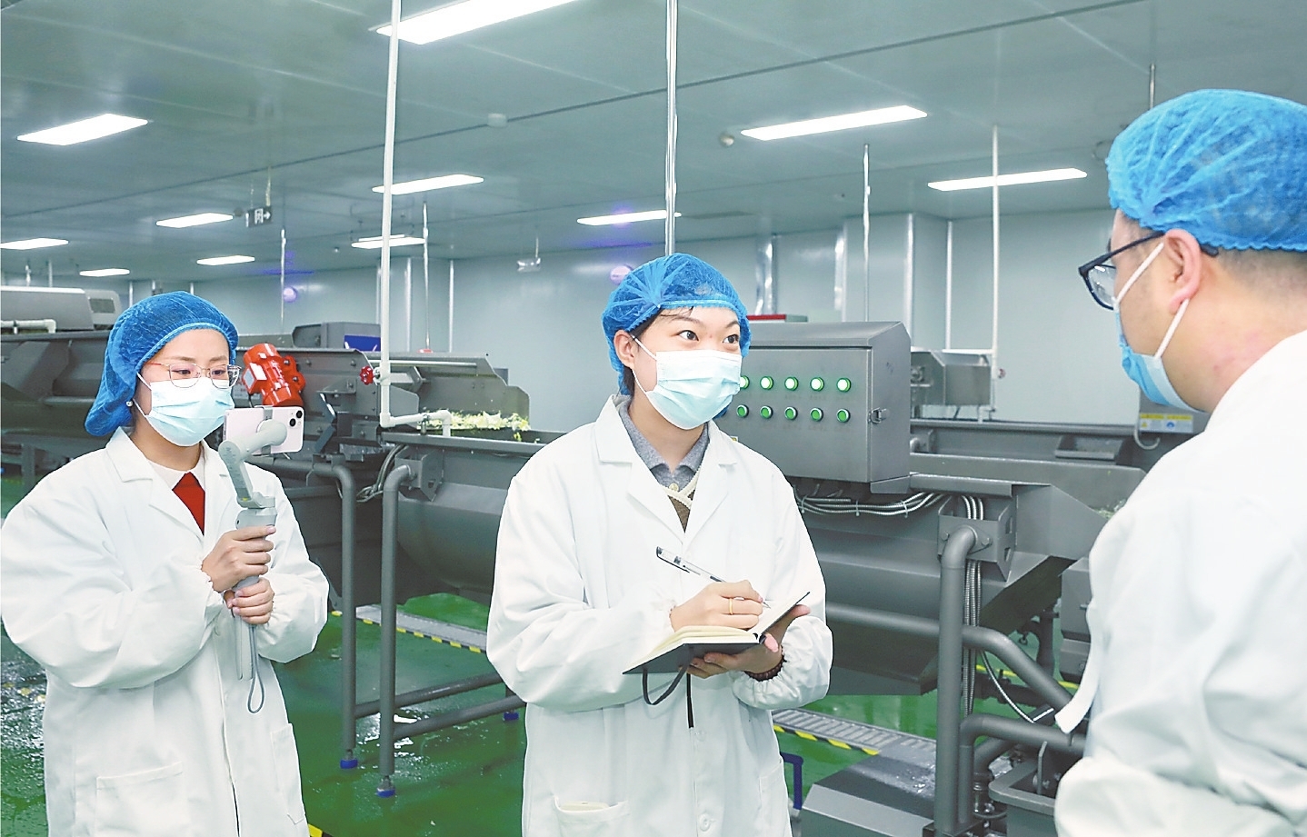 為了更深入、直觀的感受“凈菜”生產過程,攝影記者陳月振、新媒體記者閆海雪及文字記者崔朋瑋換上防護服裝,戴上手套、口罩、頭發罩,穿過風淋室,經過全方位消毒后,步入凈菜生產間。流水線上的土豆絲、芹菜條、白菜段成了攝影記者陳月振鏡頭中的主角,他對準這些干凈鮮亮的產品一頓“狂拍”。新媒體記者閆海雪則將鏡頭對準了生產線上忙碌的工人,拍攝下一幕幕忙碌而有序的場景與畫面。實地采訪更讓年輕記者崔朋瑋對衡水凈菜有了更多了解,并引以為傲。