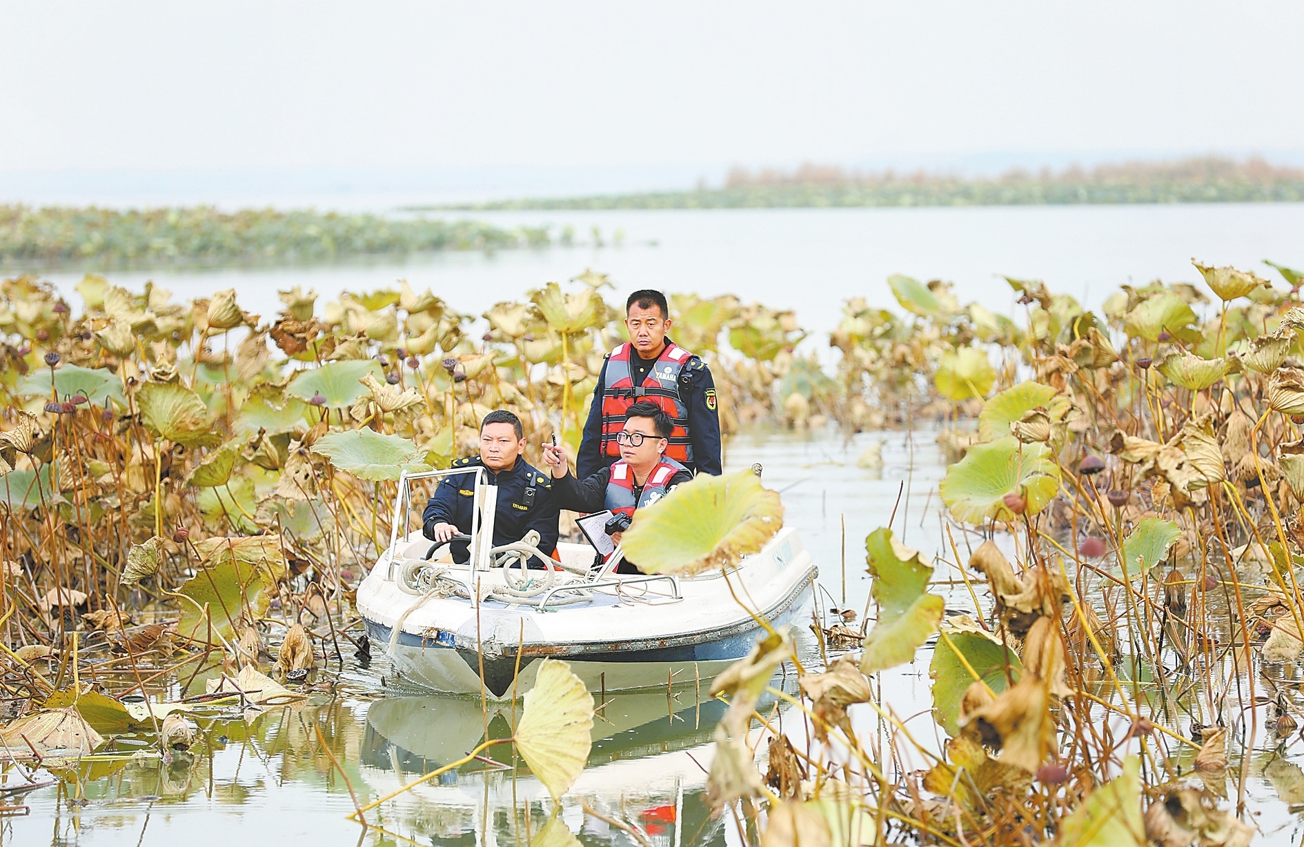 因為熱愛,所以不畏艱辛。記者張玲玲急忙拿起手中的筆記本,將眼前美景帶來的心靈震感記錄下來。攝影記者張松則舉起相機對準了湖面鳥類嬉戲場景不停按下快門。在拍攝小天鵝時,為了找到最佳拍攝地點,記者張凱穿行在2米高的蘆葦叢中。記者霍錦彪踏過泥濘的沼澤地,跟隨工作人員踏上巡邏艇,觀察拍攝湖面候鳥。
