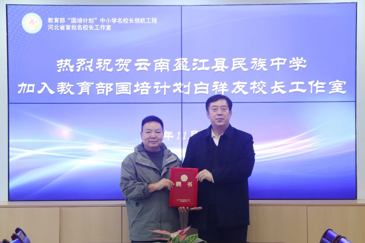 衡水市教育局督學、衡水十三中黨委書記白祥友(右)為盈江縣民族完全中學黨委書記袁輝頒發聘書。