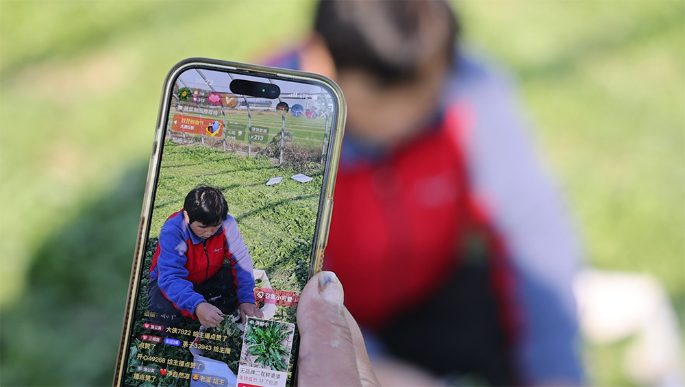 在農(nóng)場(chǎng)里做直播帶貨。崔賢飛 攝