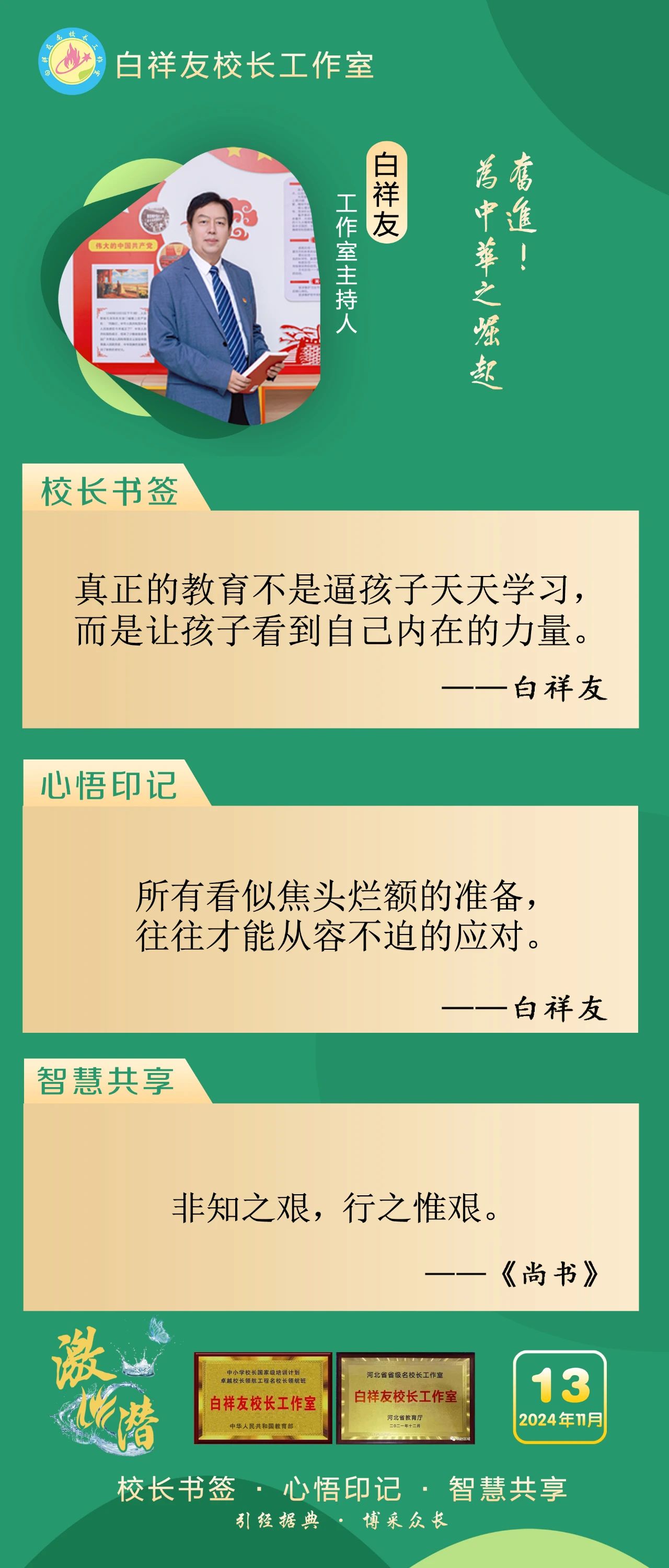 “白祥友校長工作室”成立于2019年4月,是教育部“國培計劃”中小學名校長領航工程、河北省首批名校長工作室,目前省內外成員校48個。工作室堅持“資源共享、智慧共融、互助共贏”理念,已成為思想碰撞的交流場,資源共享的品牌站,成果展示的輻射源。