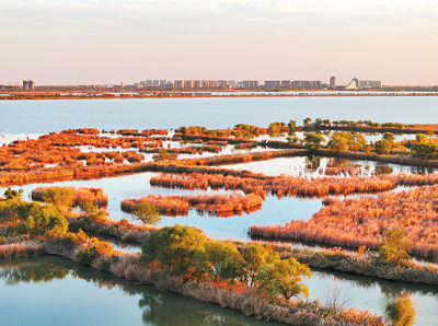 梅花島蘆葦蕩前,鳥(niǎo)兒在成群嬉戲。