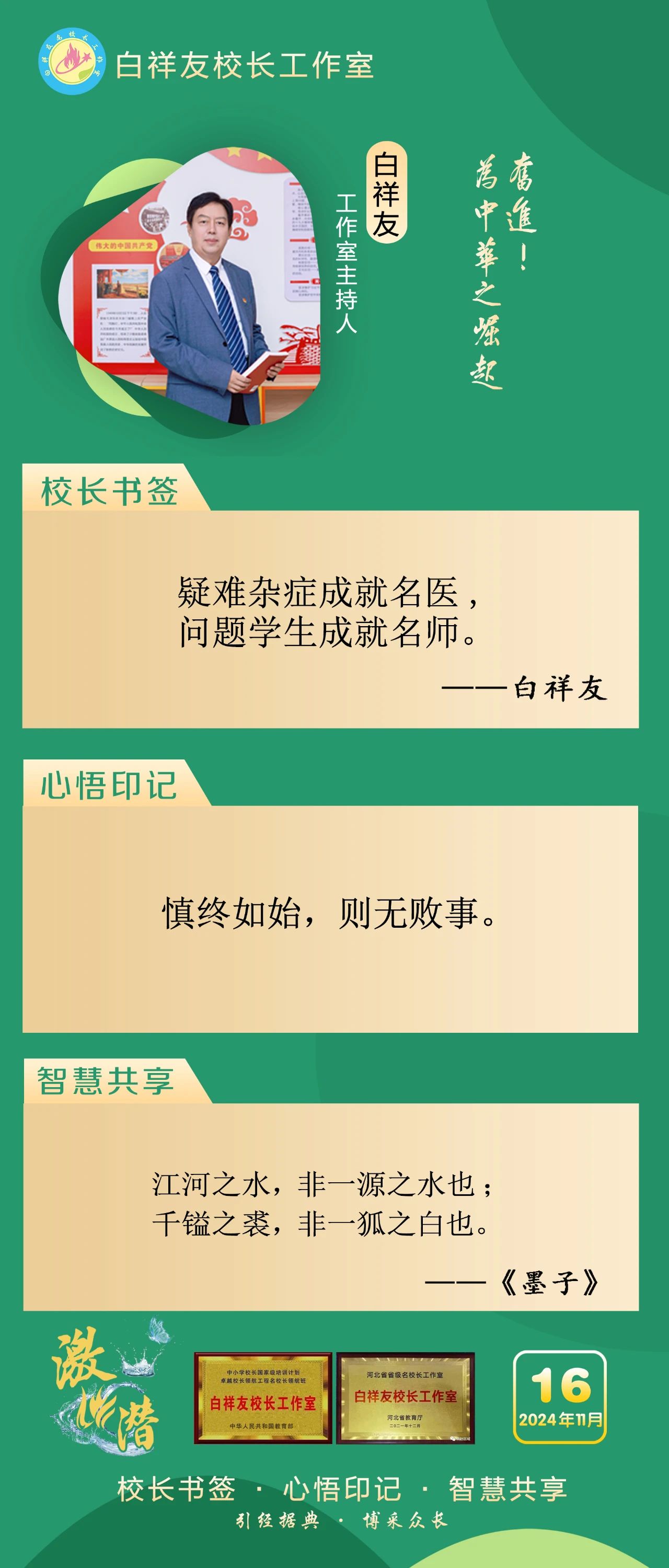 “白祥友校長工作室”成立于2019年4月,是教育部“國培計劃”中小學名校長領航工程、河北省首批名校長工作室,目前省內外成員校48個。工作室堅持“資源共享、智慧共融、互助共贏”理念,已成為思想碰撞的交流場,資源共享的品牌站,成果展示的輻射源。