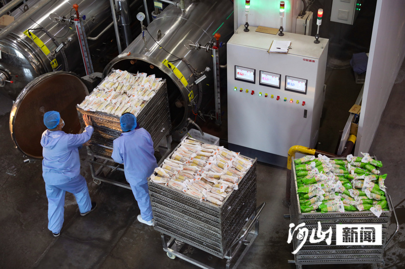 智能化標準生產線上,又是另一番場景。在常溫玉米滅菌車間,分揀削切的玉米經鎖鮮技術處理后,被推入蒸煮罐內進行殺菌,經過一小時高溫蒸煮,從粒到芯實現真正的滅菌。眼下雖不是玉米收獲期,包裝車間里卻忙碌非常,十幾名工人將真空包裝的甜糯玉米,熟練分類、平臺劃分、打包裝箱、貼單分揀……