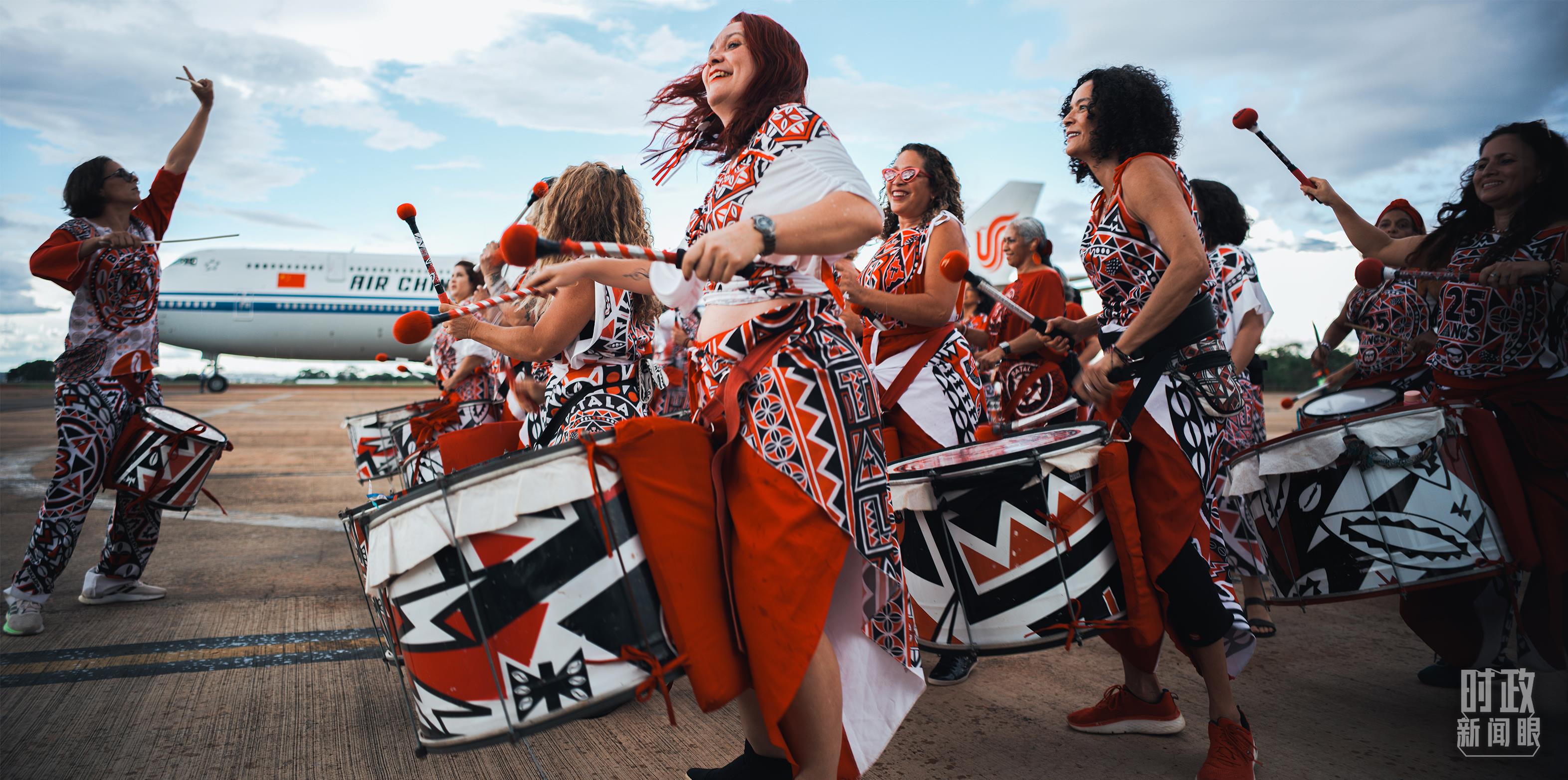 △習(xí)主席乘專機(jī)抵達(dá)巴西利亞,藝術(shù)家演奏特色鼓樂。(總臺央視記者彭漢明拍攝)