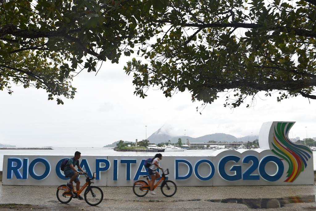 ?? 11月16日,在巴西里約熱內盧,人們騎車經過二十國集團領導人峰會舉辦地附近的峰會標識。新華社發(盧西奧·塔沃拉攝)