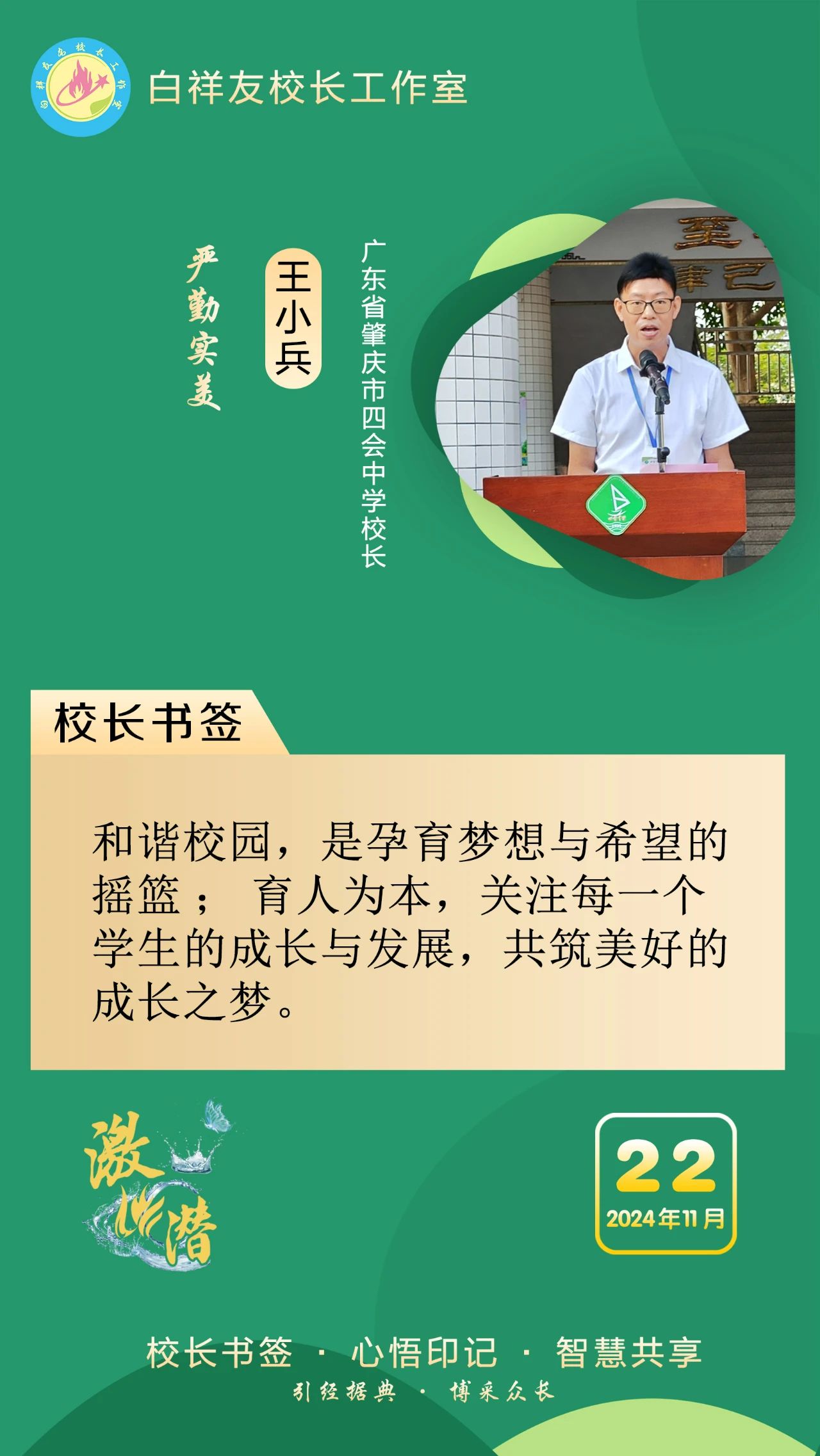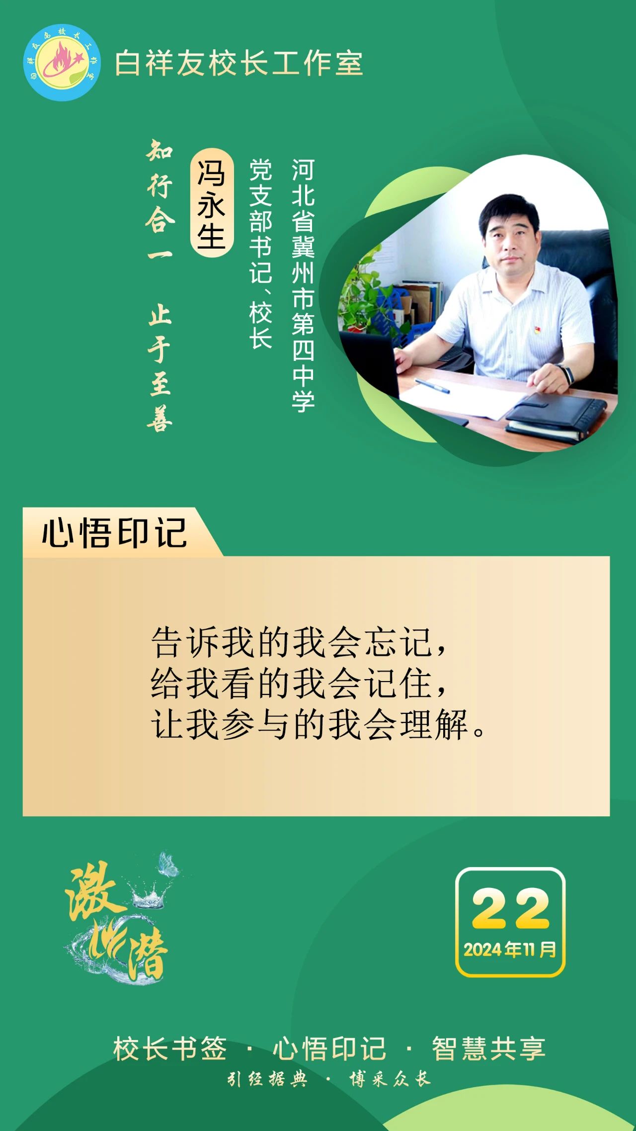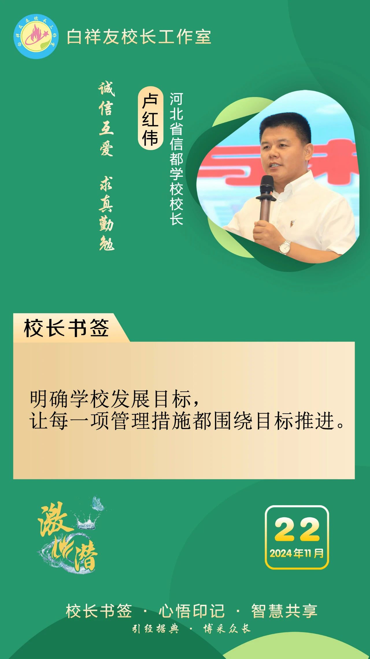 “白祥友校長工作室”成立于2019年4月,是教育部“國培計劃”中小學名校長領航工程、河北省首批名校長工作室,目前省內外成員校48個。工作室堅持“資源共享、智慧共融、互助共贏”理念,已成為思想碰撞的交流場,資源共享的品牌站,成果展示的輻射源。