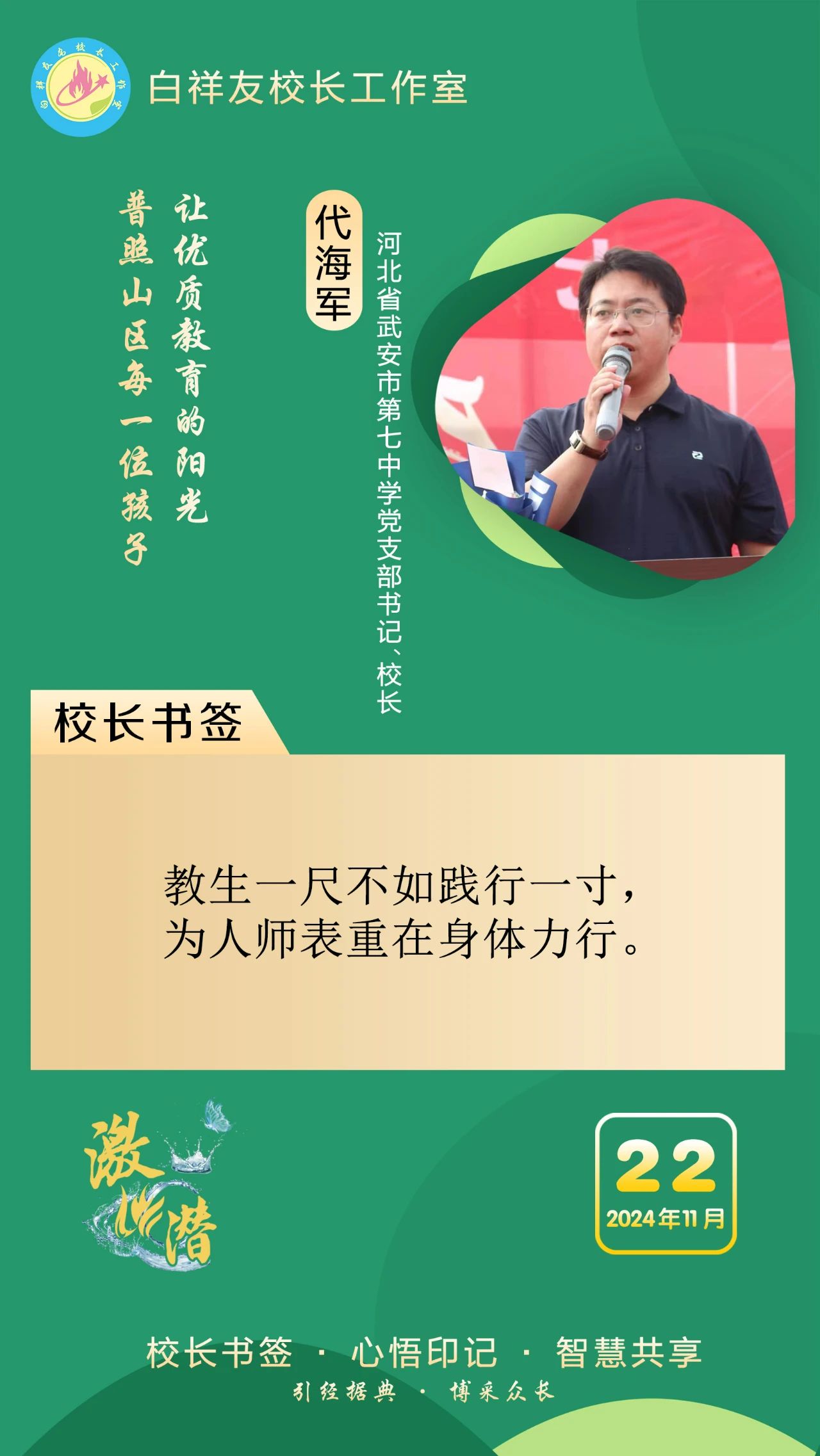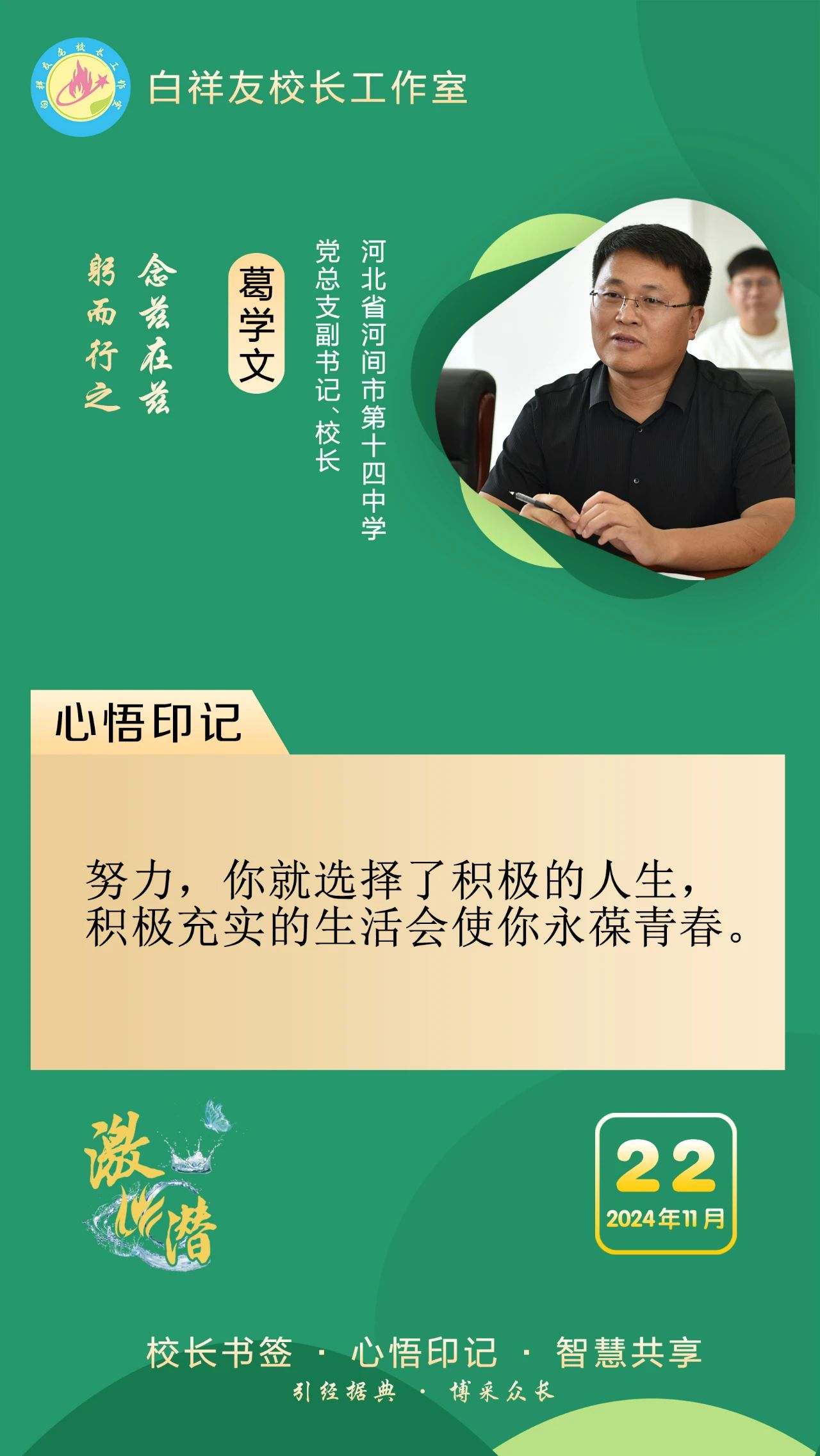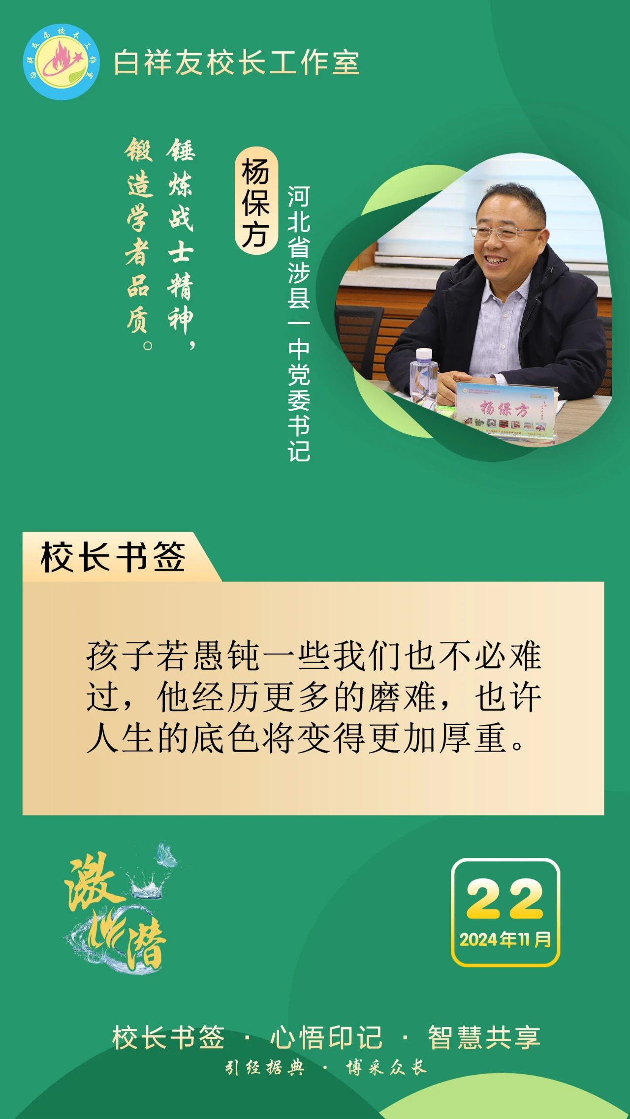 “白祥友校長工作室”成立于2019年4月,是教育部“國培計劃”中小學名校長領航工程、河北省首批名校長工作室,目前省內外成員校48個。工作室堅持“資源共享、智慧共融、互助共贏”理念,已成為思想碰撞的交流場,資源共享的品牌站,成果展示的輻射源。