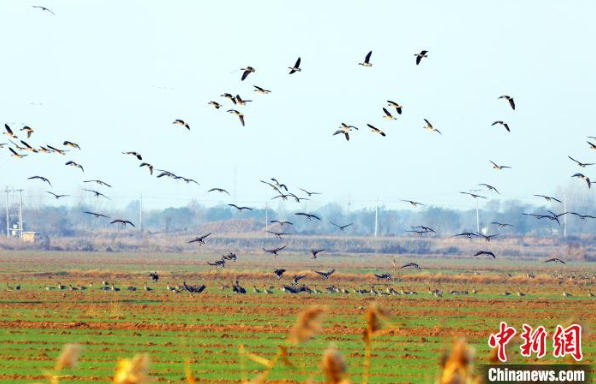 圖為鳥類在衡水湖畔的麥田里棲息覓食。張凱 攝