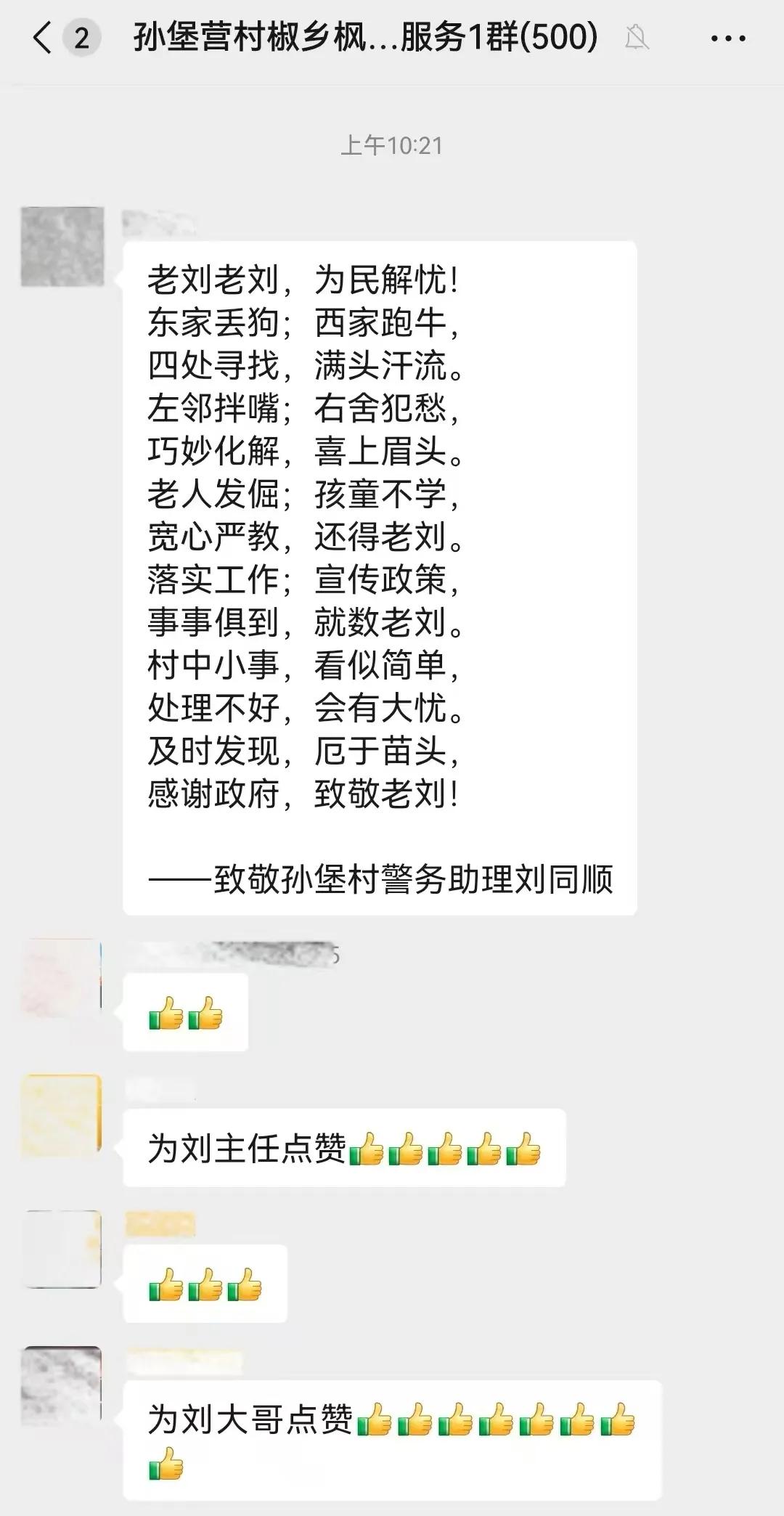 前不久,雞澤鎮城隍西村一名村民在微信群里詢問,稱閨女是名體育特長生,3天后要到石家莊參加考試,卻發現身份證過期了,想了解能不能及時補辦。村警務助理許林林立即將這一情況通過二級群反饋到三級群。縣公安局戶政科科長李彥奎看到信息直接聯系省公安廳制證中心后回復村民:已經溝通好,正加急辦理。第二天中午,這名村民在一級群里回復:孩子身份證已經拿到,感謝您。