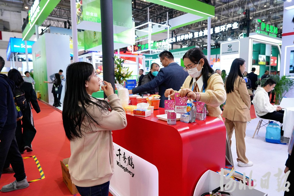 11月26日拍攝的第二屆鏈博會綠色農(nóng)業(yè)鏈展區(qū)里的河北千喜鶴飲食股份有限公司展臺。圖為嘉賓試吃展臺產(chǎn)品。河北日報記者 王偉攝