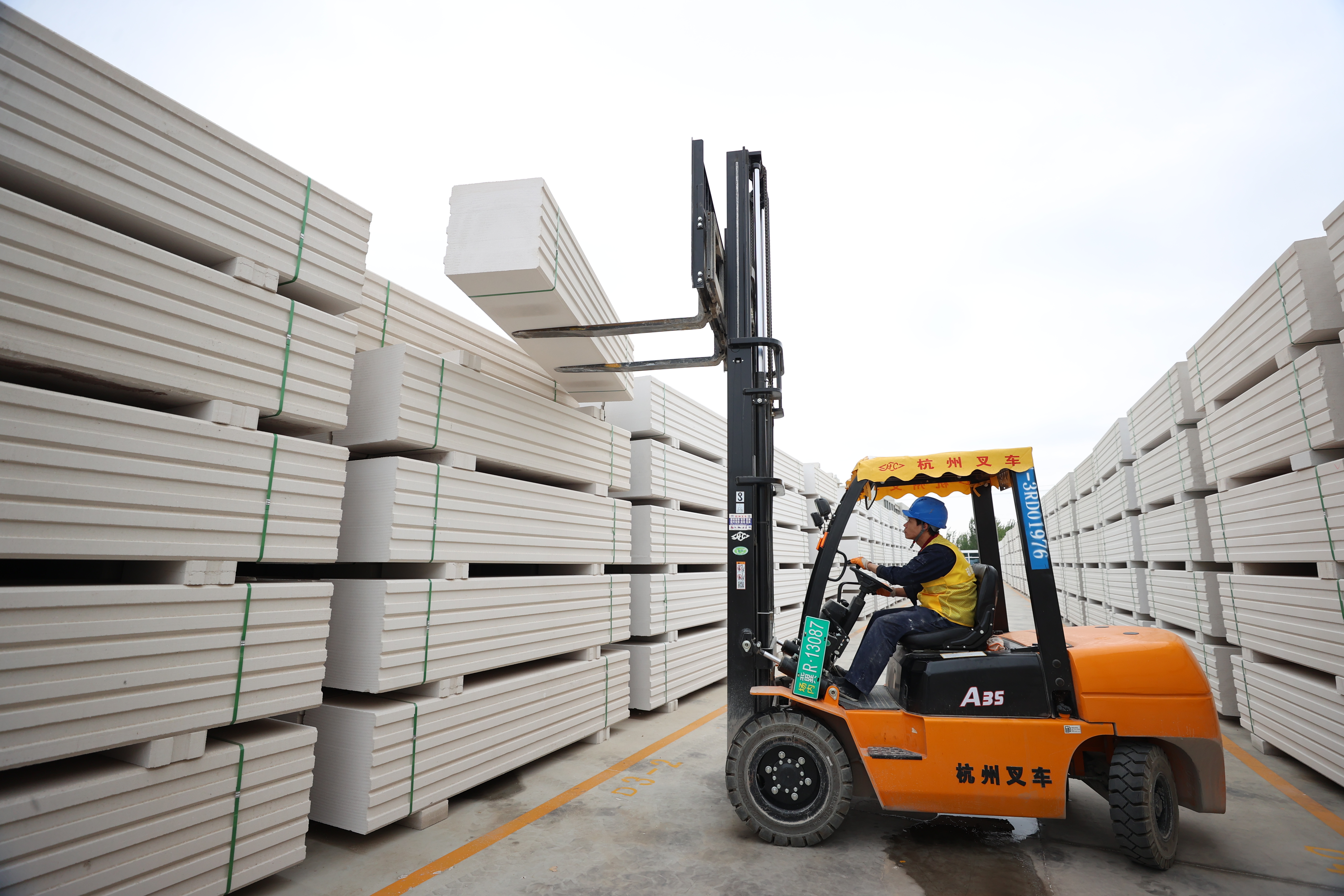 圖為文安縣玖順建材有限公司產品碼放區,工人正在碼放成品。