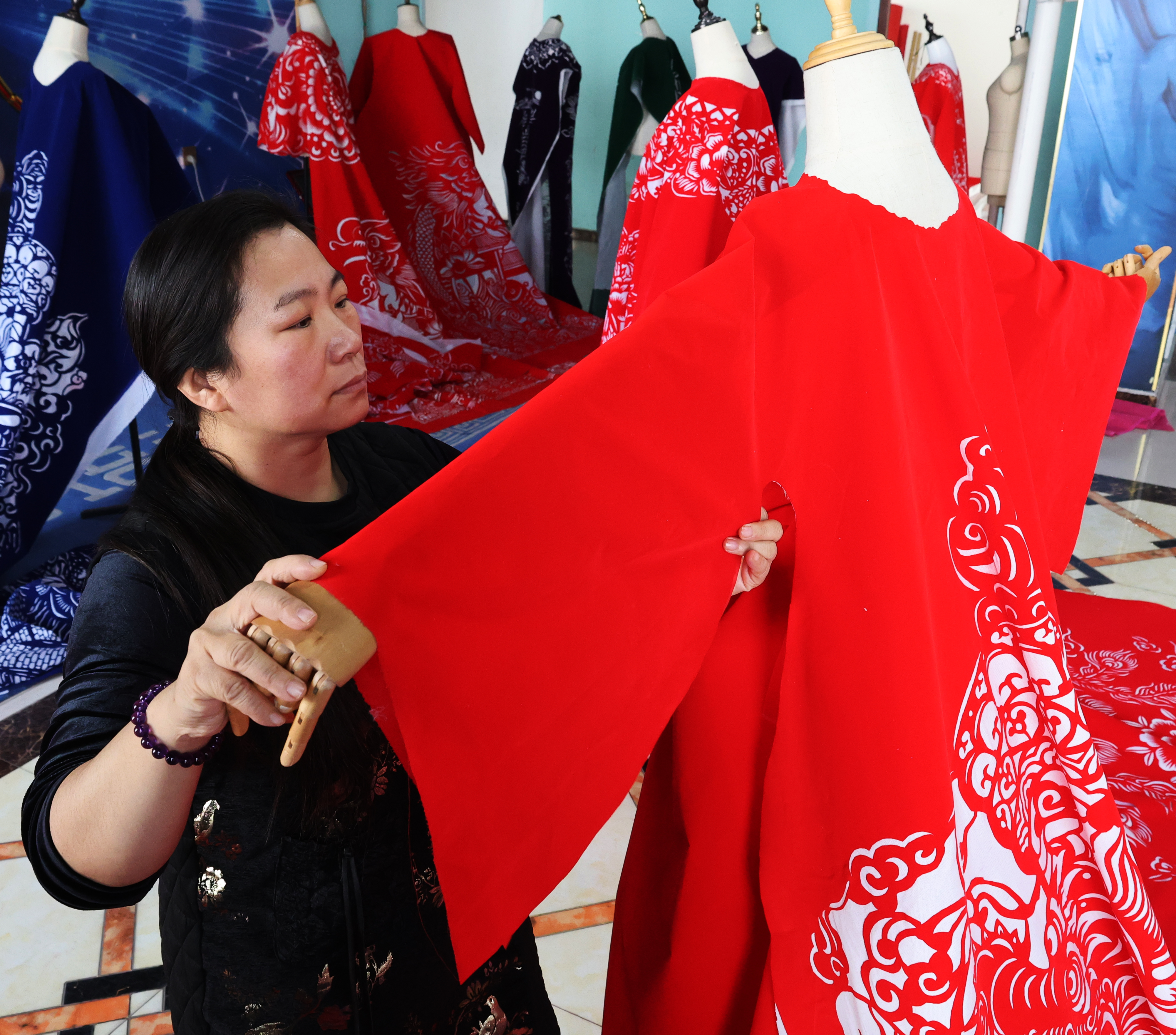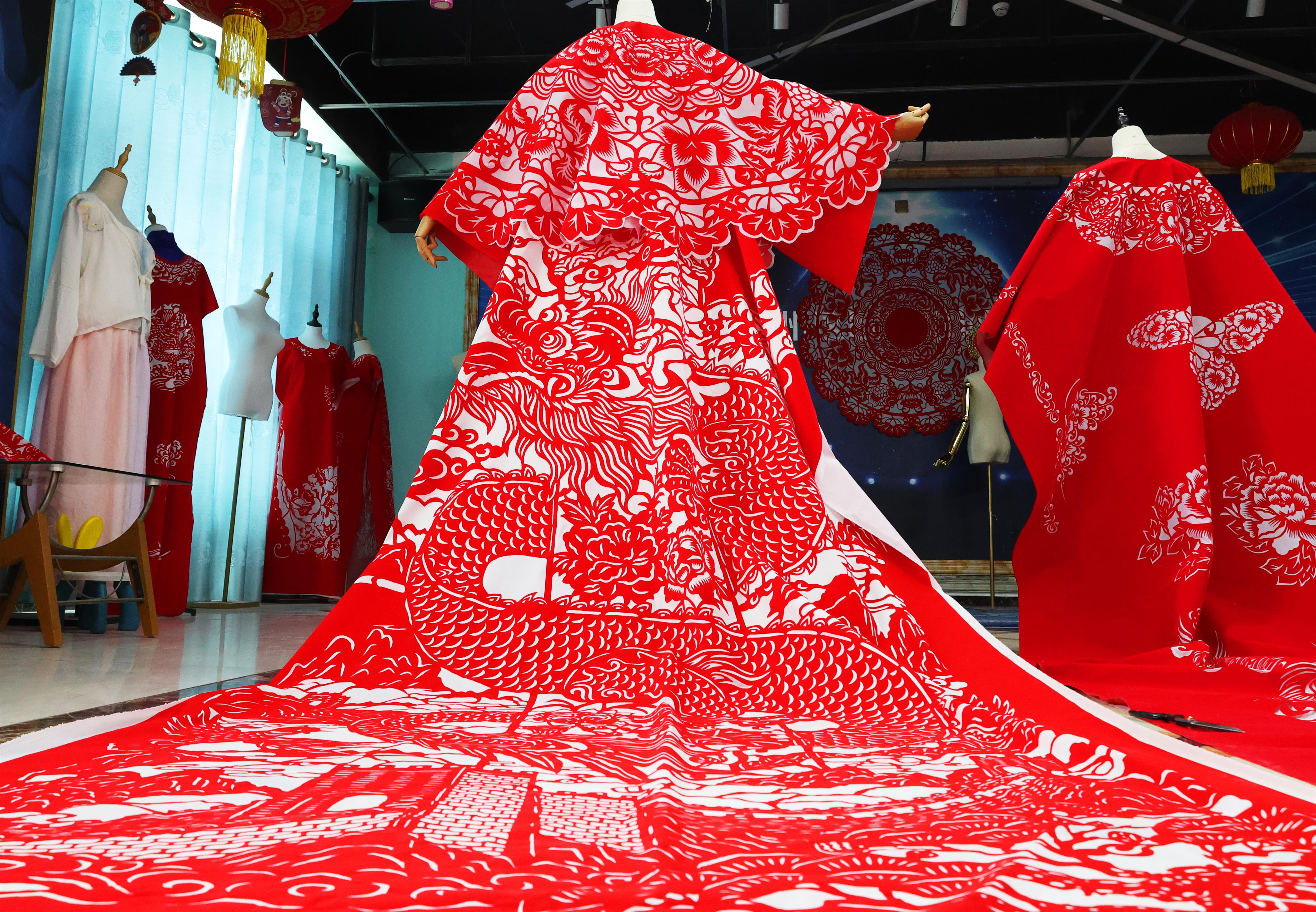 12月10日,記者走進(jìn)李娜的工作室,只見(jiàn)屋內(nèi)各類剪紙服裝琳瑯滿目,紅、藍(lán)、綠、紫等色彩相互交織。李娜正忙碌地為新客戶趕制同款紅色剪紙服裝,她滿臉喜悅地說(shuō):“自從視頻爆火后,巴黎、日本等好多國(guó)外博主都來(lái)找我定制,這幾天忙得不可開(kāi)交,吃住都在工作室了。”