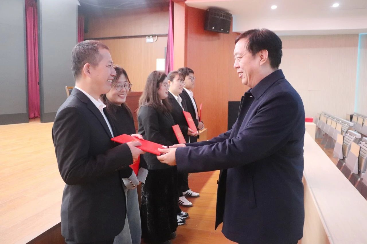 市教育局督學(xué)、衡水十三中黨委書(shū)記白祥友(右)為在大公開(kāi)課大教研活動(dòng)中表現(xiàn)優(yōu)異的教師頒獎(jiǎng)。