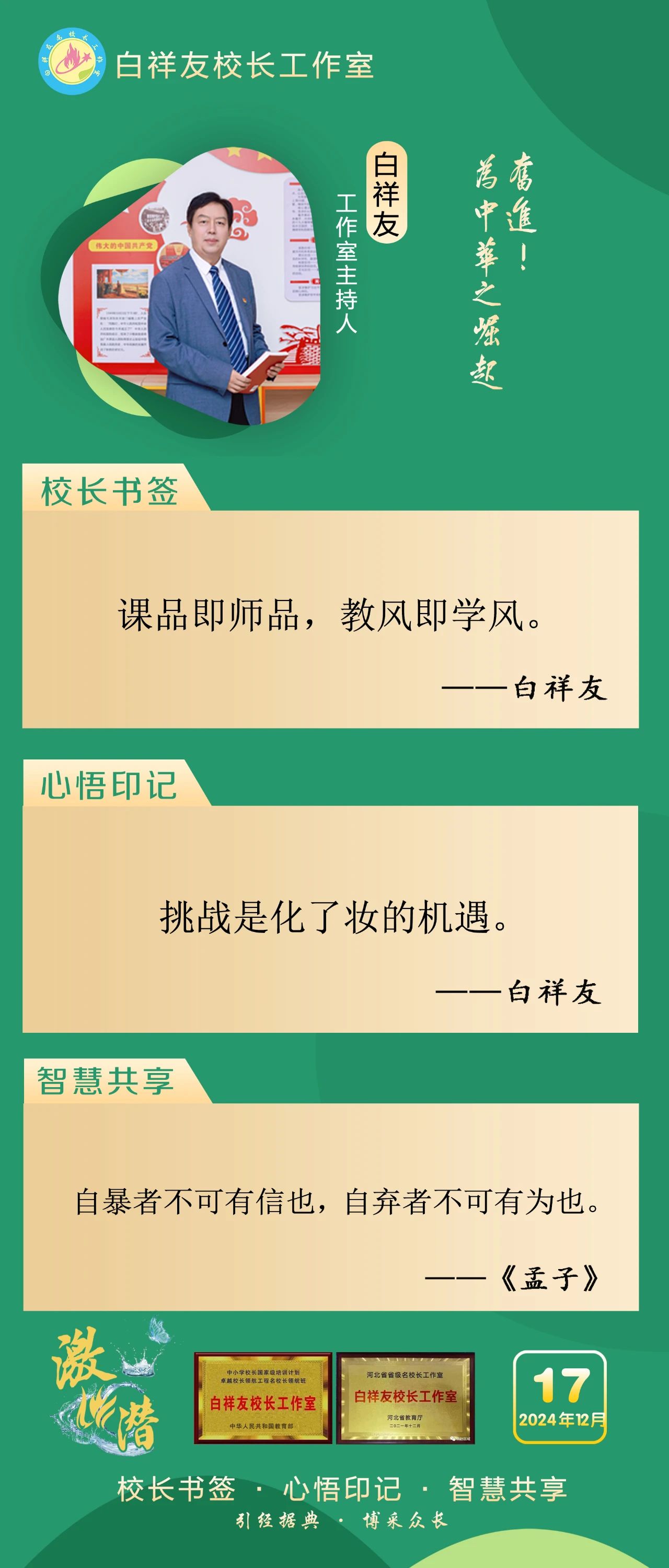 “白祥友校長(zhǎng)工作室”成立于2019年4月,是教育部“國(guó)培計(jì)劃”中小學(xué)名校長(zhǎng)領(lǐng)航工程、河北省首批名校長(zhǎng)工作室,目前省內(nèi)外成員校48個(gè)。工作室堅(jiān)持“資源共享、智慧共融、互助共贏”理念,已成為思想碰撞的交流場(chǎng),資源共享的品牌站,成果展示的輻射源。