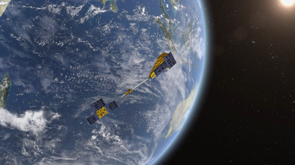 ??“澳科一號”衛(wèi)星在軌示意圖(右為A星,左為B星)。圖片由澳門科技大學(xué)“澳科一號”團(tuán)隊(duì)提供