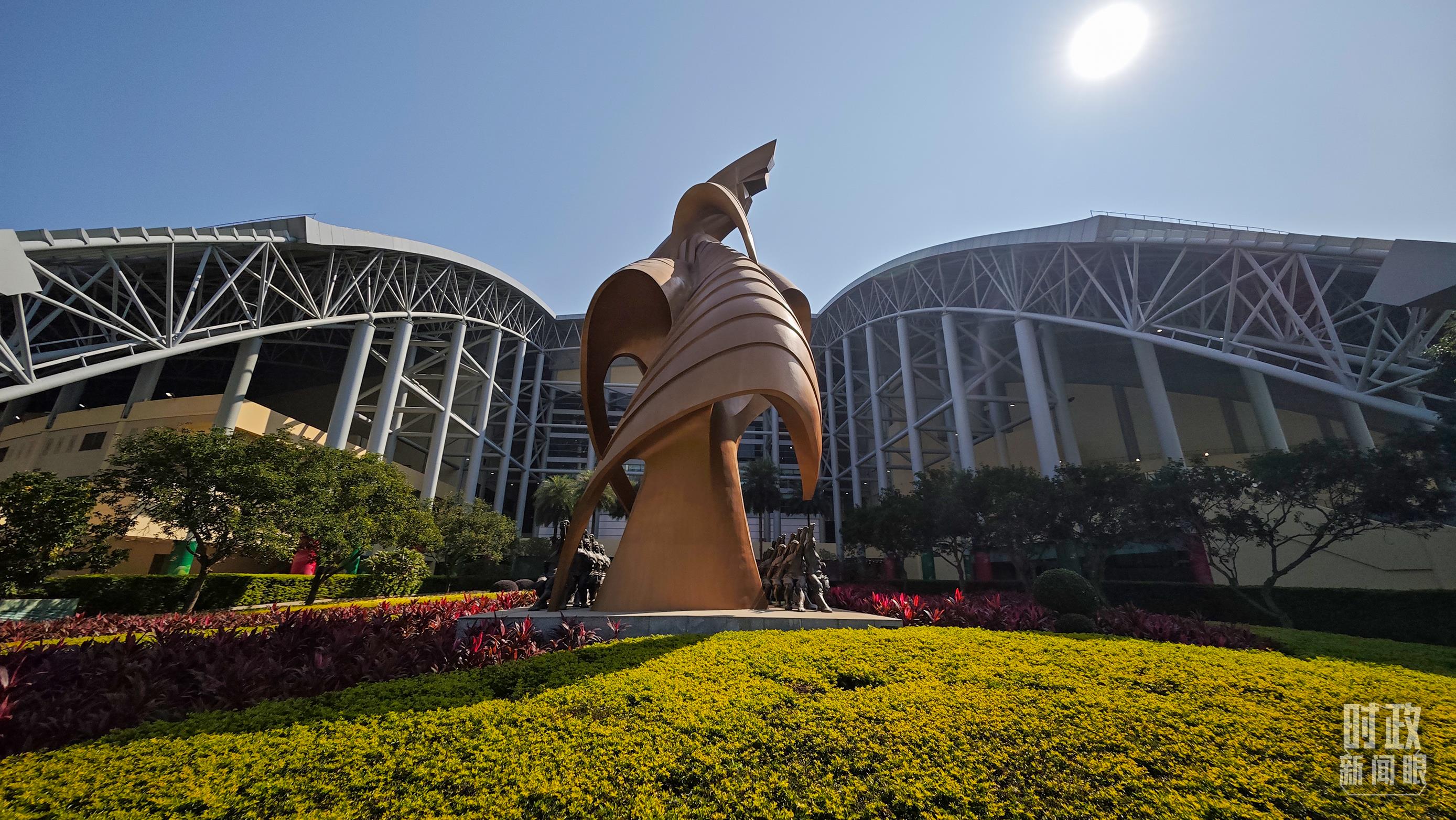 △澳門東亞運動會體育館前,名為“揚帆”的巨型雕塑熠熠生輝。(總臺央視記者彭漢明拍攝)