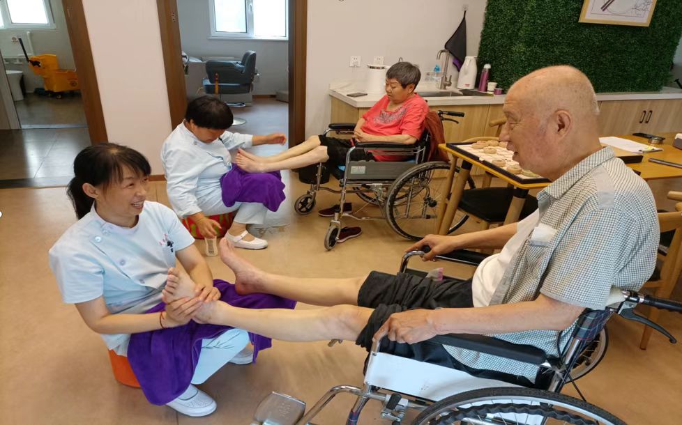 昊和沁園小區日間照料中心內,工作人員正在為老人按摩。(資料照片)