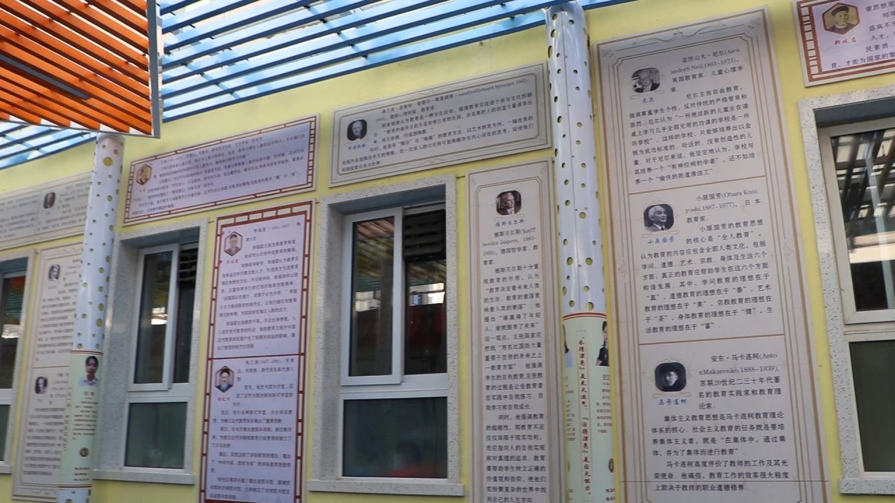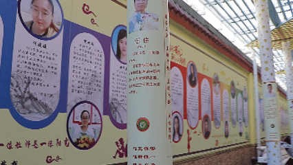 燈光打開,車棚宛如一條星光大道。東側墻面上是132位古今中外教育家的介紹,老師們存放電動車、自行車的時候,抬頭就能看到這些教育大家,激勵老師們向教育名家學習;西側墻面與之呼應的是十三中的優秀教師展板,展示十三中優秀教師的成績,號召全體教師向他們學習。