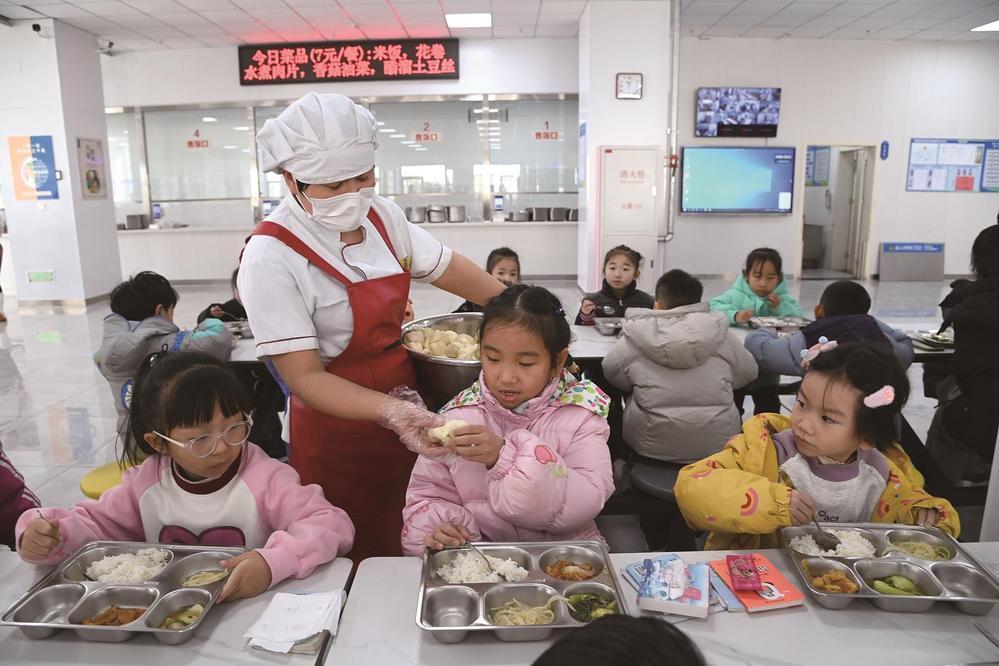 學校營養午餐,葷素搭配、營養均衡、不限量供應,讓每個孩子“花得少”“吃得好”。