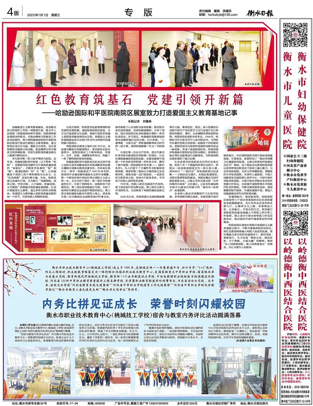 加強愛國主義教育基地建設,是創建全國文明城市工作的一項重要內容。衡水市人民醫院(哈勵遜國際和平醫院)黨委按照新發展理念的要求,在推動精神文明建設工作改進創新時,努力把哈勵遜國際和平醫院南院區展室打造成為愛國主義教育基地,通過深挖自身文化內涵、提煉文化特色,充分發揮教育功能和示范功能,促進精神文明與物質文明協調發展,切實為醫院高質量發展注入源源不斷的動力。