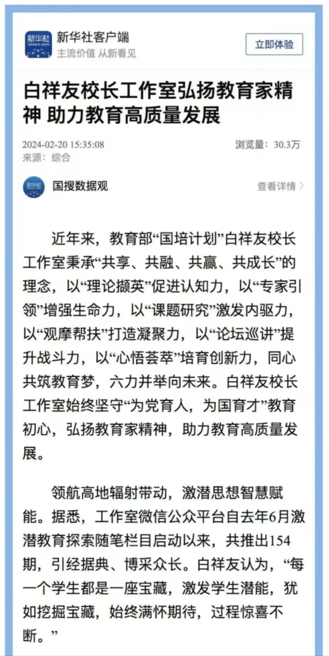 這一年,支教幫扶傾力帶動,媒體報道頻頻上榜。派遣經驗豐富的優秀教師到新疆、西藏支教。積極推進落實衡水市優質教育資源共享幫扶工程,與阜城四中圍繞教師隊伍建設、班級管理等內容開展六次互動交流。為推動教育部《基礎教育課程教學改革深化行動方案》落地實施,共同推進教育教學的創新與發展,4月20日,與阜城第四中學教育教研聯盟正式啟動。5月26日,阜城四中副校長劉愛民帶領學校教師參與我校第十四期教師專業化成長全員培訓會。9月26日,阜城縣第四中學副校長米海燕等一行,參觀交流。10月25日,阜城縣第四中學副校長劉愛民一行參加公開課活動。11月13日,阜城縣第四中學教師團隊觀摩了學校班主任藝術節暨第六屆班主任基本功大賽。12月20日,阜城縣第四中學副校長劉愛民帶領教師團隊,共同參與了我校第十六期“群策融智 凝心聚能”教師專業化成長全員培訓活動。隨著工作室的發展壯大,眾多媒體聚焦工作室多項研修活動。中國網19次報道工作室激潛教育探索隨筆。中國日報網、中國教育報、學習強國平臺、河北日報、河北新聞網、等多家媒體報道工作室的動態情況。新華社記者劉仝保對工作室主持人白祥友書記進行題為《探索“激爆潛能”領航中學教育》的專題報道。新華社發表《白祥友校長工作室弘揚教育家精神,助力教育高質量發展》,報道教育部白祥友校長工作室五周年紀實。