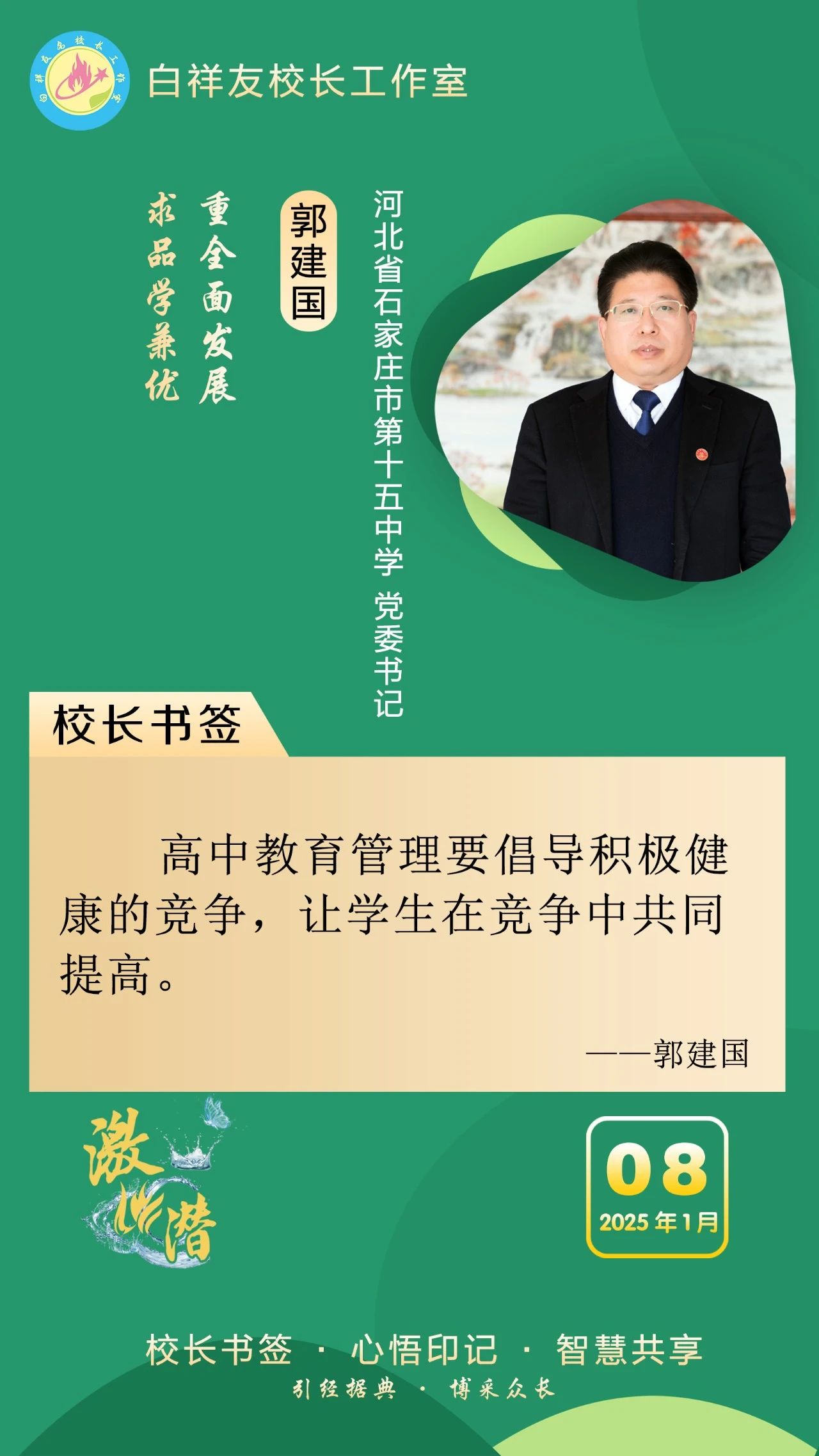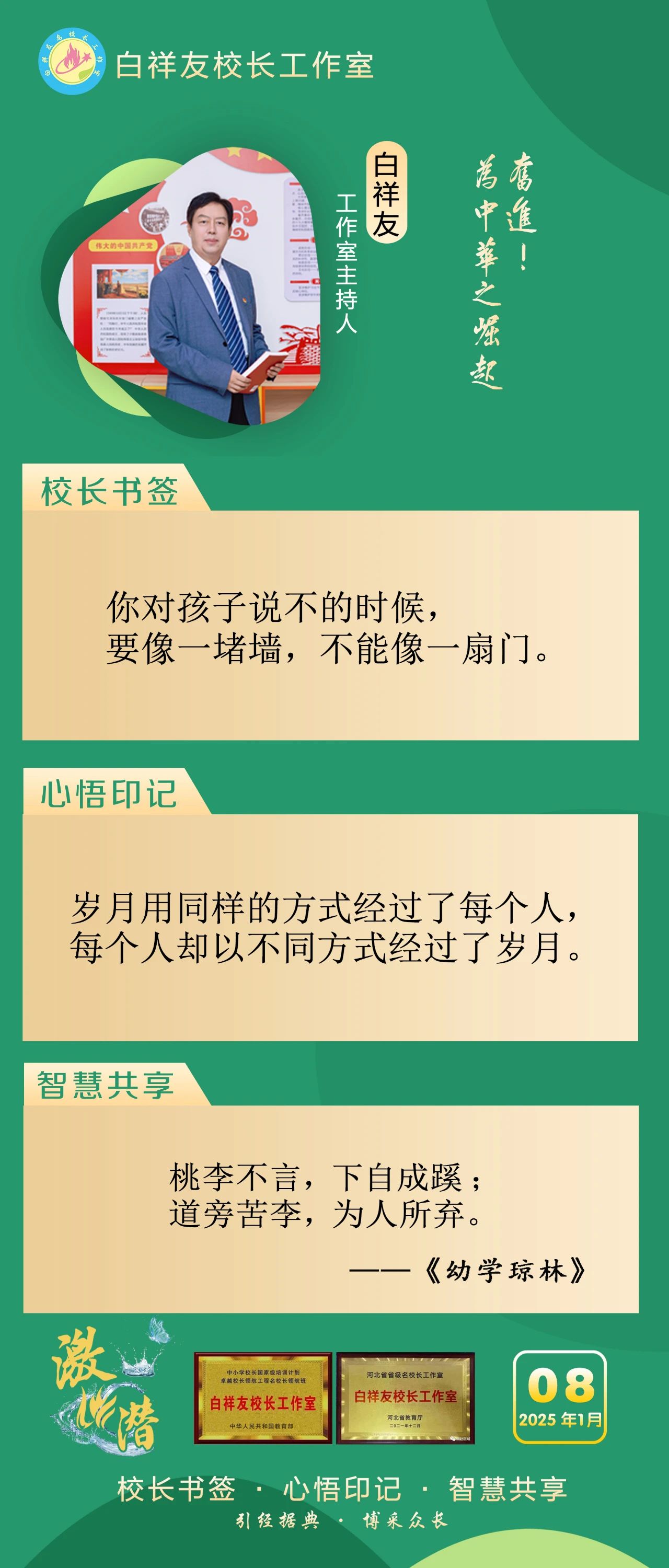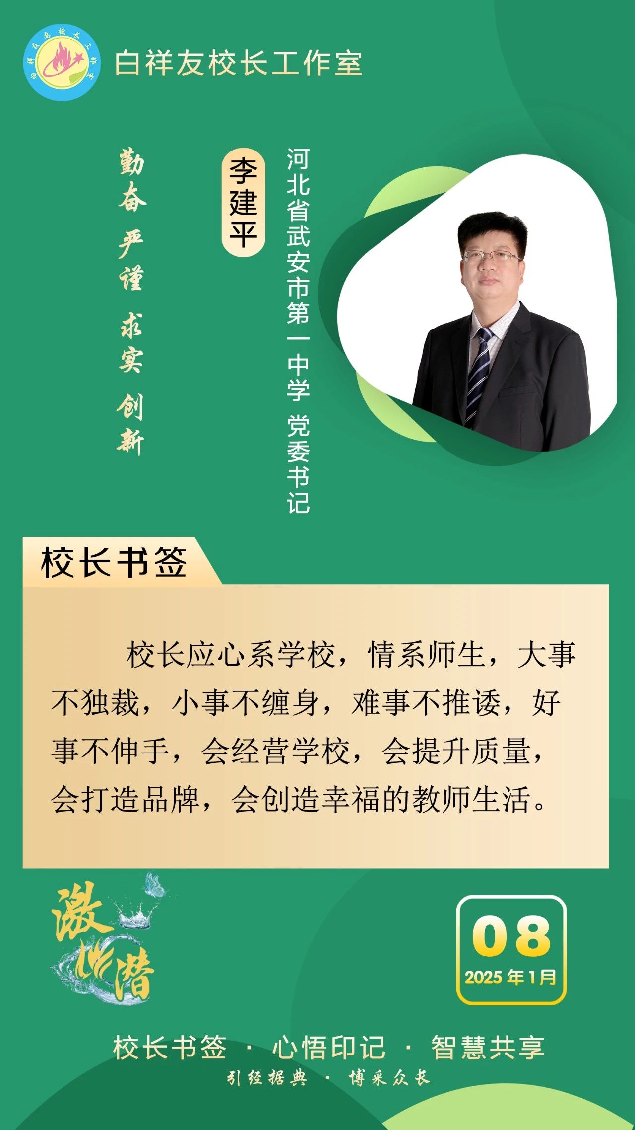 “白祥友校長工作室”成立于2019年4月,是教育部“國培計劃”中小學名校長領航工程、河北省首批名校長工作室,目前省內外成員校48個。工作室堅持“資源共享、智慧共融、互助共贏”理念,已成為思想碰撞的交流場,資源共享的品牌站,成果展示的輻射源。