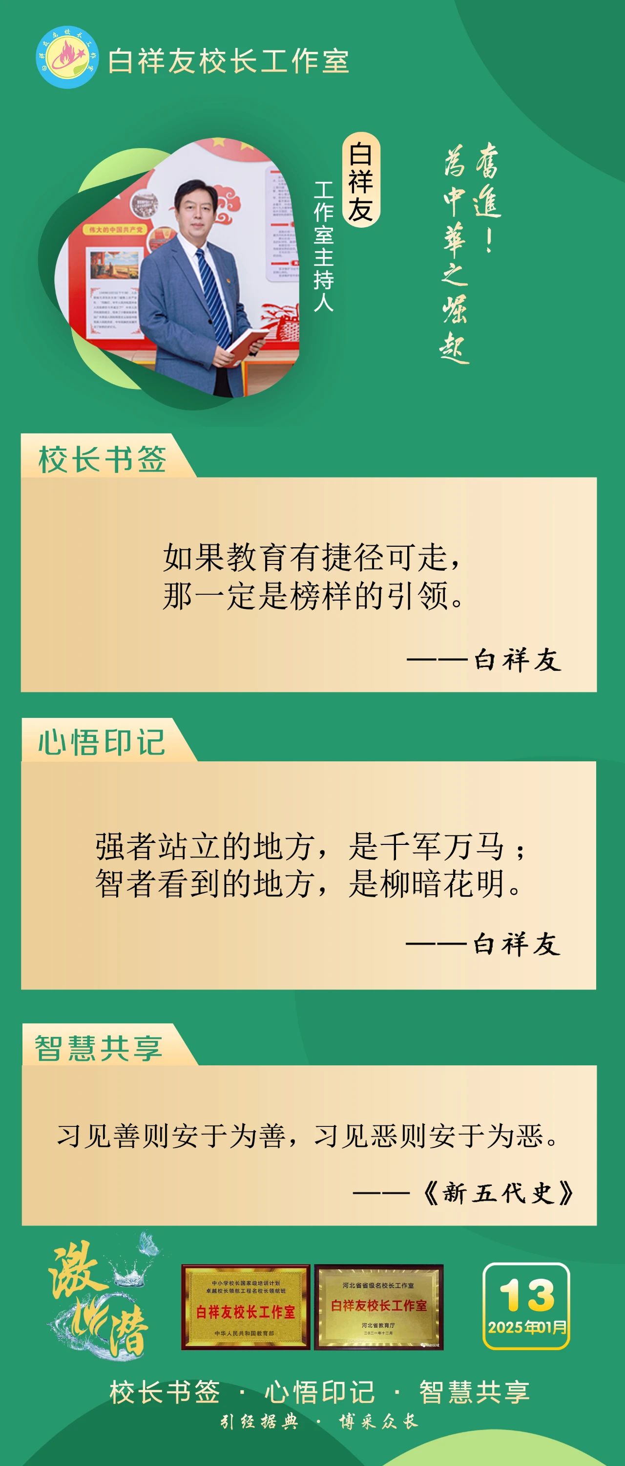 “白祥友校長(zhǎng)工作室”成立于2019年4月,是教育部“國(guó)培計(jì)劃”中小學(xué)名校長(zhǎng)領(lǐng)航工程、河北省首批名校長(zhǎng)工作室,目前省內(nèi)外成員校48個(gè)。工作室堅(jiān)持“資源共享、智慧共融、互助共贏”理念,已成為思想碰撞的交流場(chǎng),資源共享的品牌站,成果展示的輻射源。